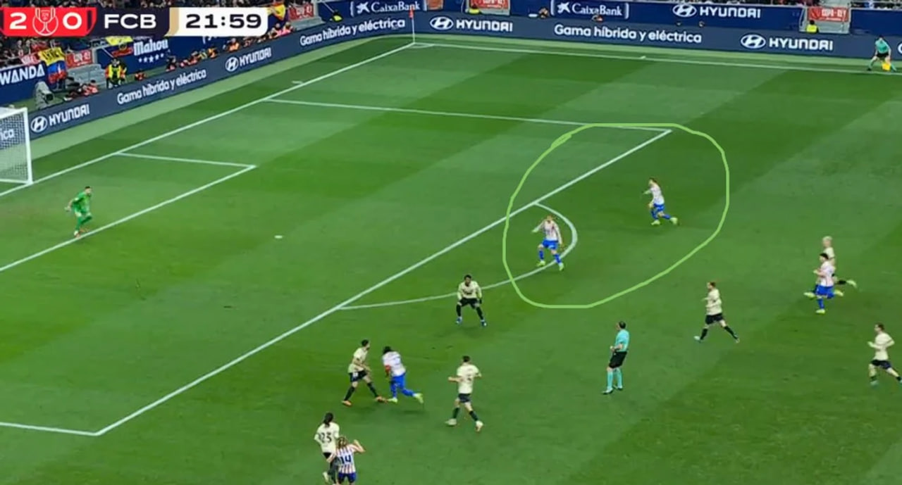 Меҳмонлар ўйиннинг 70 фоиз вақтида тўпга эгалик қилди, аммо ўйинни «Атлетико» назорат қилди. Ўйиннинг 7-дақиқасидаёқ Эрик Гарсия ўз жамоаси дарвозасини ишғол этиб қўйди: бу вазиятда майдон ҳолати каталонияликларга панд берди, тўп дўнглик туфайли сапчиб кетди ва дарвозабон Жоан Гарсия уни тўхтата олмади.