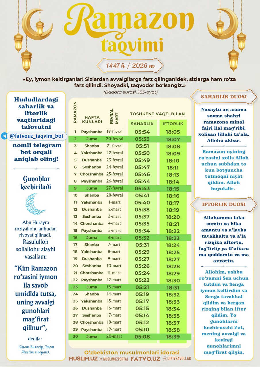 Ўзбекистон мусулмонлари идораси 2026 йилги Рамазон тақвимини эълон қилди.