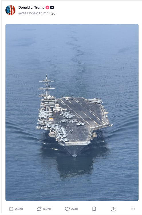 Трамп ўзига тегишли бўлган Truth Social платформасида Американинг Яқин Шарққа олдинроқ юборилган USS Abraham Lincoln авиаташувчиси олдига йўл олган ушбу авиаташувчининг аэрофотосини жойлаштирган.