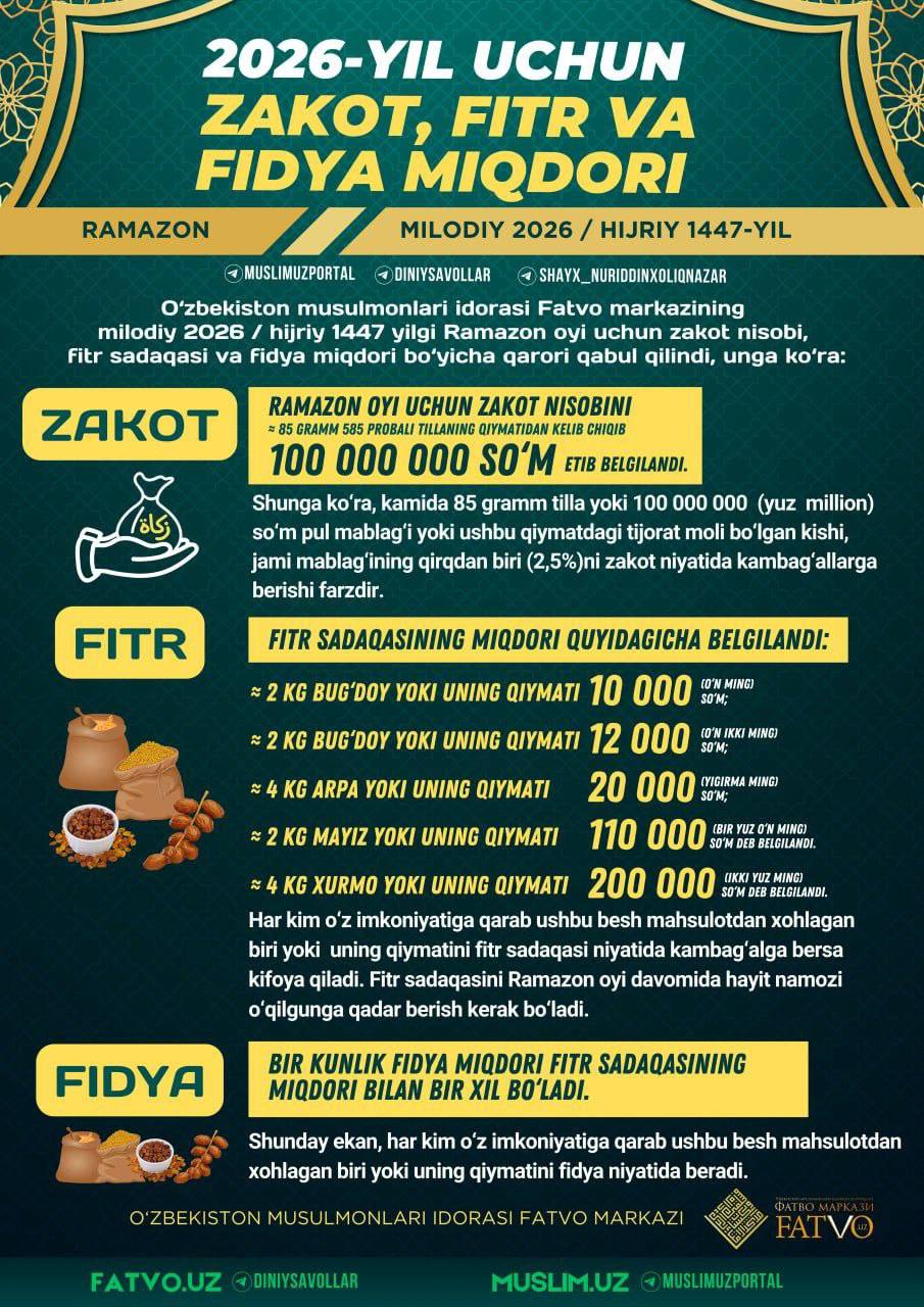 Ўзбекистон мусулмонлари идораси Фатво марказининг милодий 2026 / ҳижрий 1447 йилги Рамазон ойи учун закот нисоби, фитр садақаси ва фидя миқдори бўйича қарори қабул қилинди. Унга кўра:
