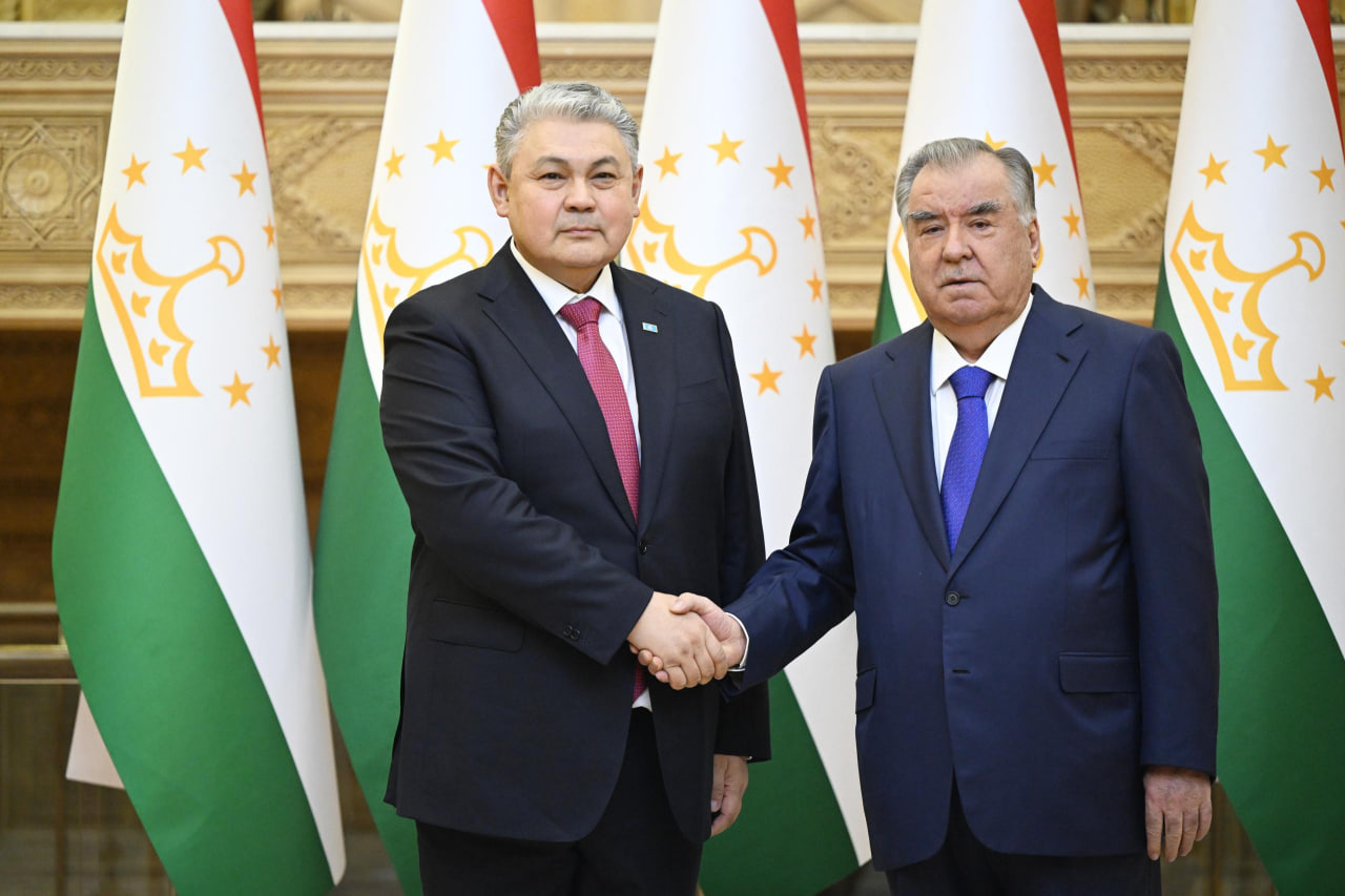 Имомали Раҳмон Қозоғистон ташқи ишлар вазири Ермек Кошербаев билан. 16 феврал, Душанбе / Фото: Тожикистон президенти матбуот хизмати