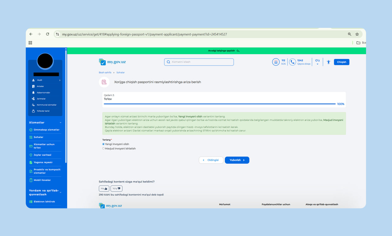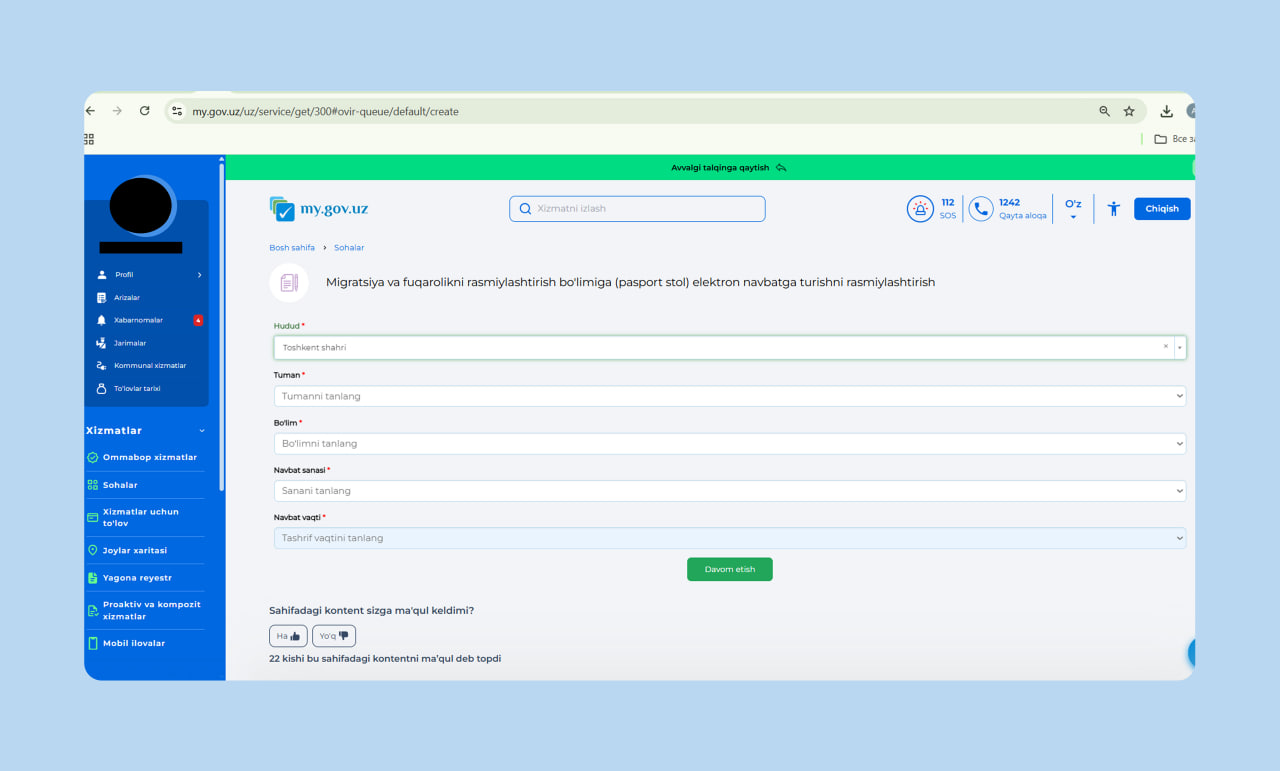 Ариза берувчи хизматни танлаганидан сўнг электрон анкета тўлдиради. Маълумотларнинг бир қисмини тизим автоматик тўлдиради, қолган маълумотларни ариза берувчи ўзи киритади.