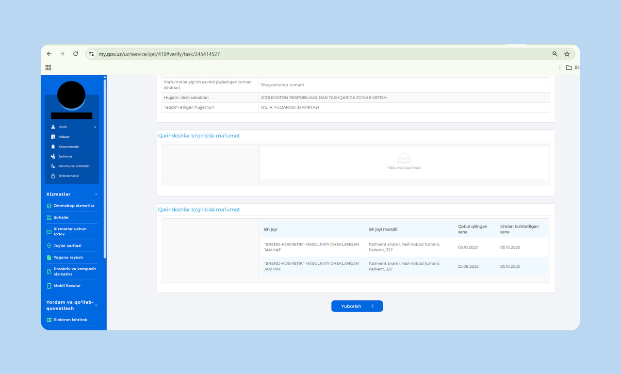 Ариза берувчи қўшимча маълумотлар – қариндошлари ва сўнгги йиллардаги меҳнат фаолияти ҳақидаги маълумотларни киритади.