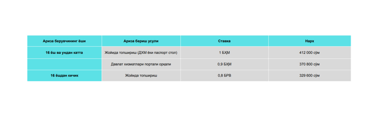 Хорижга чиқиш паспортини расмийлаштириш нархи ариза берувчининг ёши ва ариза топшириш усулига боғлиқ. Нархлар мақола тайёрланган вақтдаги БҲМ қийматига асосланган.