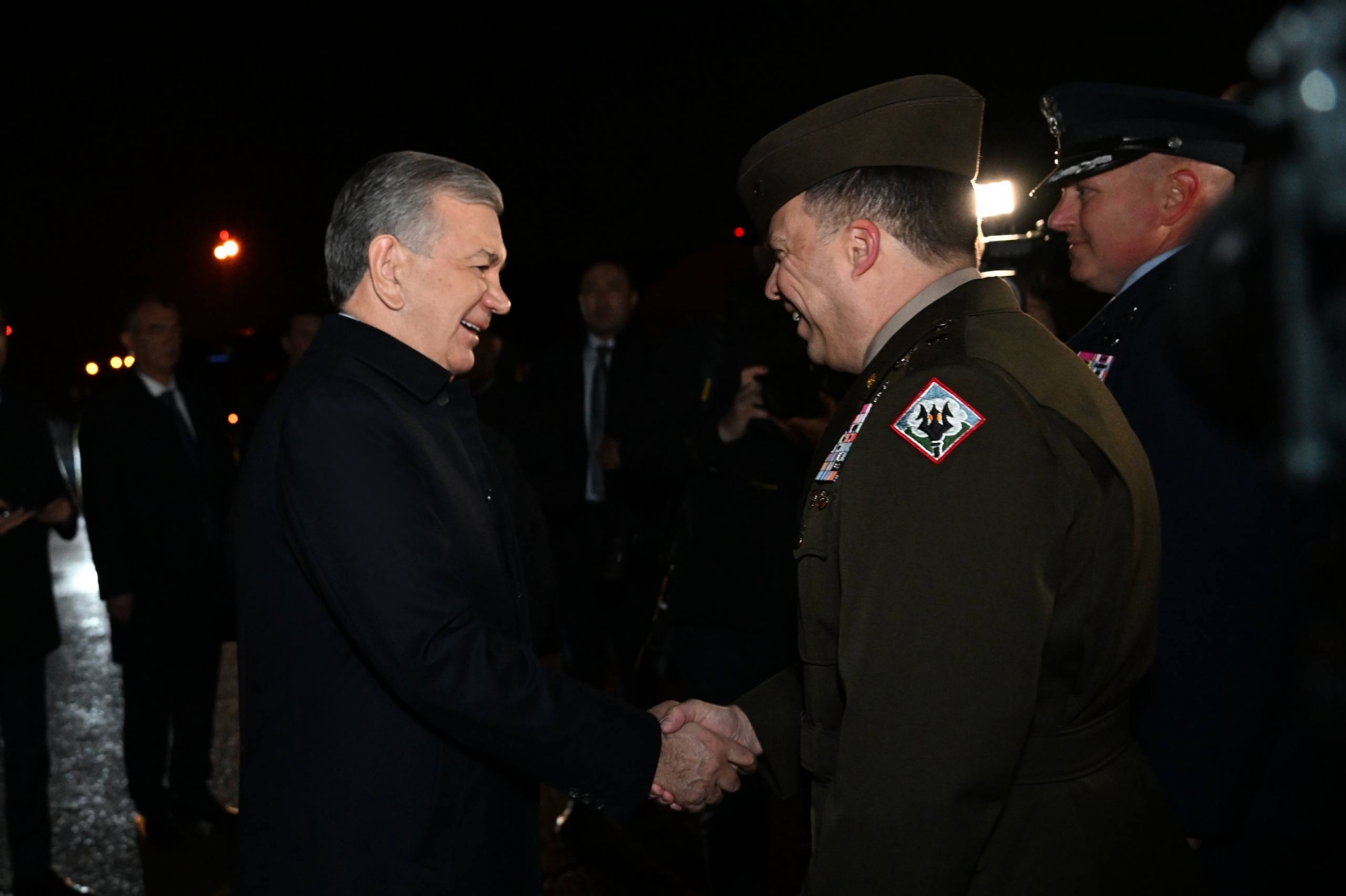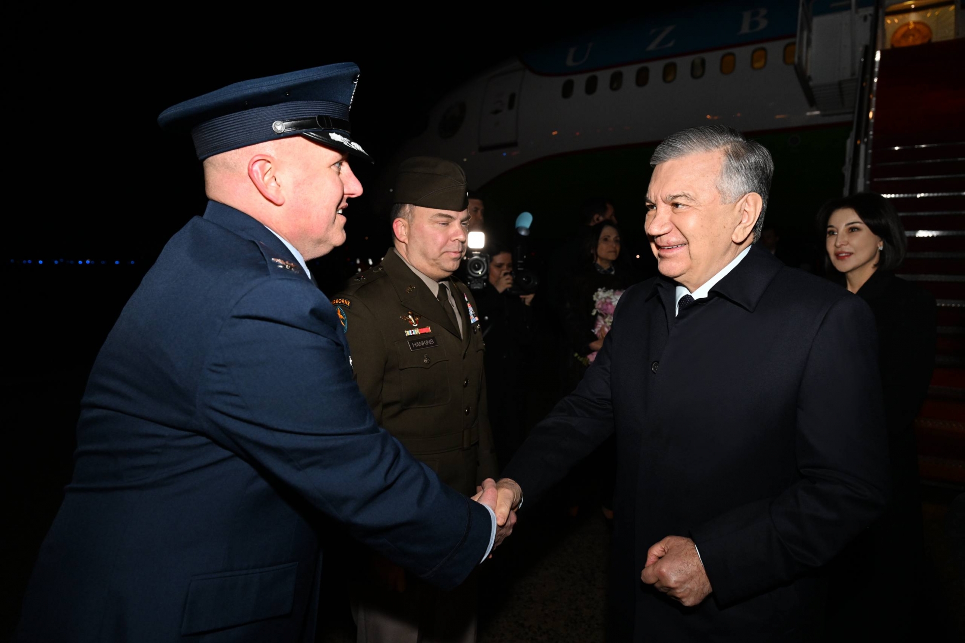 “Эндрюс” авиабазасида давлат раҳбарини АҚШ–Ўзбекистон савдо палатаси раиси Керолин Лемм, Миссисипи штати Миллий гвардияси бирлашган штаби қўмондони Жеймс Хенкинс ва бошқа расмий шахслар кутиб олди.