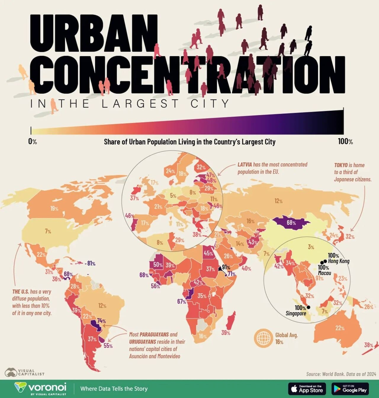 Янги харита ҳар бир мамлакат шаҳар аҳолисининг қайси қисми унинг энг йирик шаҳрида яшашини кўрсатади. Бу орқали қаерда мегаполислар ҳал қилувчи ўрин тутишини, қаерда эса аҳоли анча тенг тақсимланганини кўриш мумкин. Маълумотлар Жаҳон банки статистикасига асосланган.