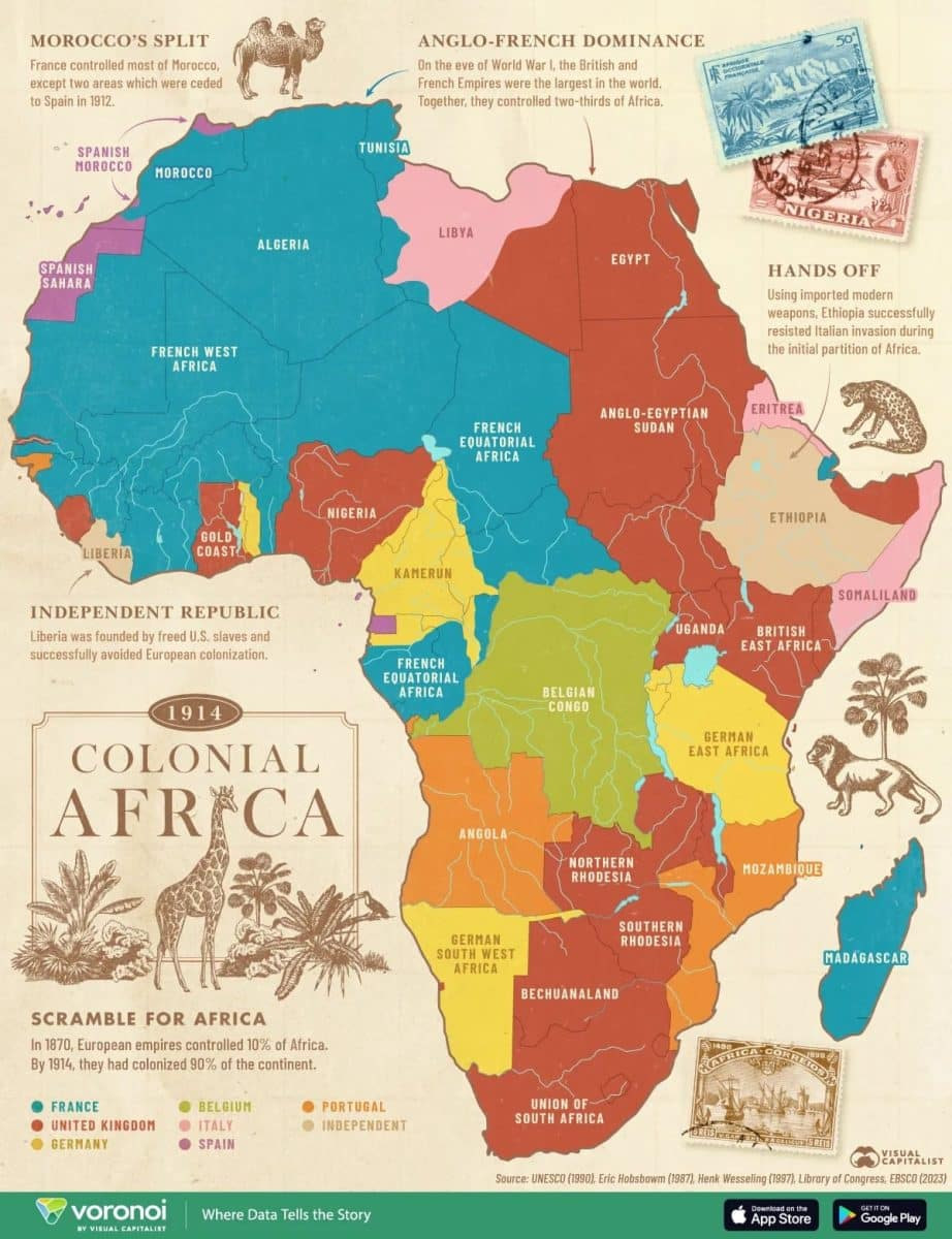 Африкадаги кўплаб ҳозирги давлат чегаралари тўғридан тўғри ана шу даврга бориб тақалади: улар аввалдан мавжуд бўлган маданий ёки сиёсий ҳудудий чегараларни эмас, балки мустамлака даври келишувларини акс эттиради. Тақдим этилган маълумотлар турли манбаларга таянади: ЮНЕСКО материаллари (1990), Эрик Хобсбаумнинг китоблари, Хенк Весселингнинг ишлари ҳамда АҚШ Конгресси кутубхонаси маълумотлари шулар жумласидан.