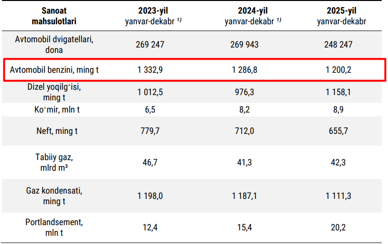 Ўз навбатида ички ишлаб чиқариш ҳажми ҳам охирги 2 йилда сезиларли даражада камайди. Масалан, 2023 йилда 1 млн 333 минг тонна бензин ишлаб чиқарилган бўлса, бу кўрсаткич 2025 йилда 1 млн 200 минг тоннагача ёки 10 фоизга қисқарган.