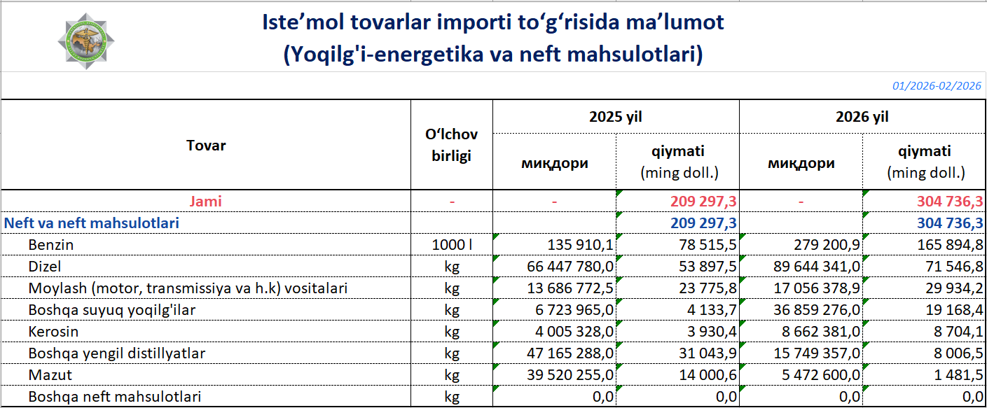 Ўзбекистонда нефт қазиб олиш ва қайта ишлаш қувватлари мавжуд бўлса-да, ички эҳтиёжни тўлиқ қоплаш учун импортга боғлиқлик йилда йилга ошиб боряпти. Божхона қўмитаси маълумотларига кўра, 2026 йилнинг январ-феврал ойларида қарийб 166 млн долларлик 279 млн литр бензин импорт қилинган. Бу 2025 йилнинг мос даврига нисбатан миқдор жиҳатдан 2 баробарга, қиймат жиҳатдан эса 2,1 баробарга кўп. Охирги ойларда ички талабнинг қарийб тенг ярми ташқаридан олиб кирилаётган бензин ҳисобига қондириляпти.