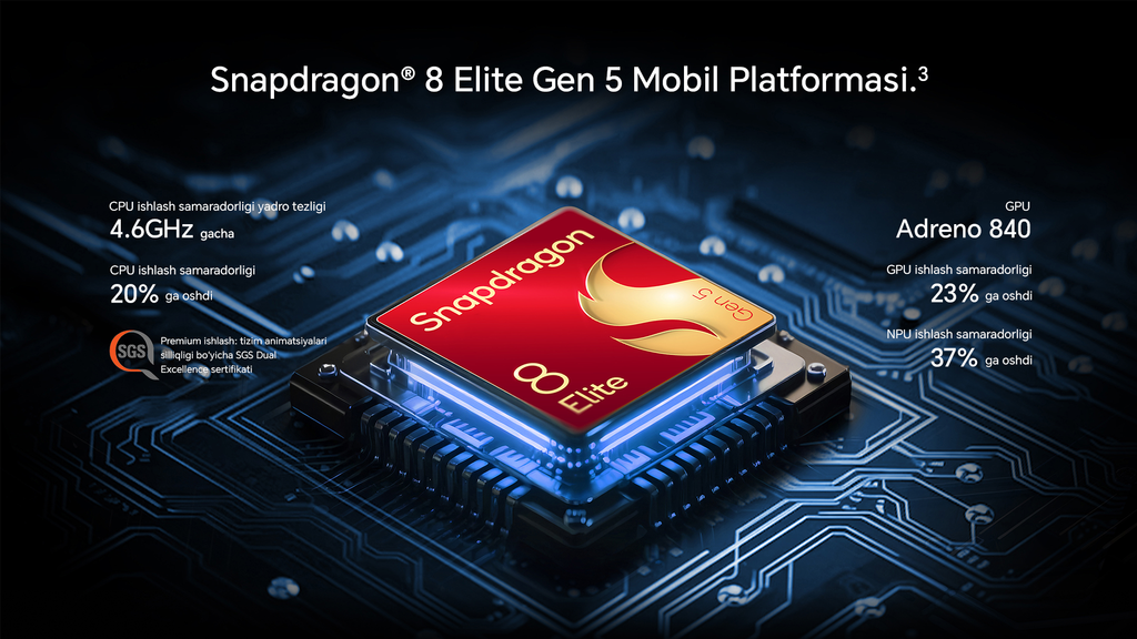 Саноатда етакчи мобил чип — Snapdragon® 8 Elite Gen 5 билан жиҳозланган ушбу қурилма CPU, GPU ва AI ҳисоблаш қуввати бўйича саноатда етакчилик қилади. HONOR Magic8 Pro’да илк бор қўлланган GPU-NPU Heterogeneous AI технологияси паст сифатли ўйин тасвирларини юқори аниқликдаги (1080p) ва силлиқ (120fps) кадрларга айлантириб беради.