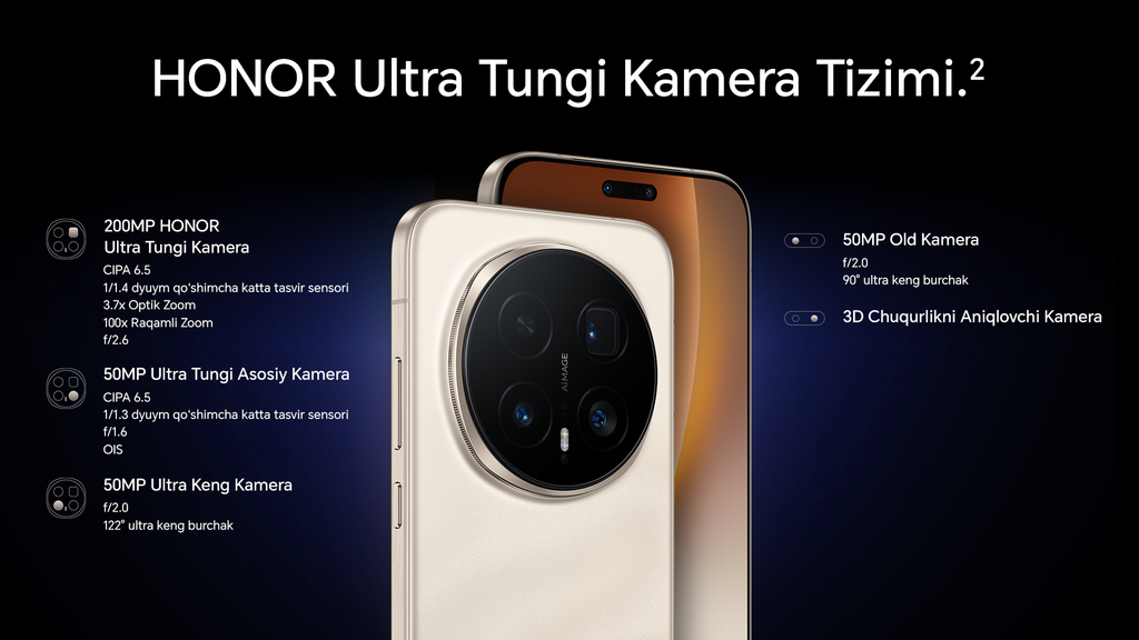 HONOR Magic8 Pro бугунги кунда саноатдаги энг илғор AI телефото тизимини тақдим этади. У 200 МП Ultra Тунги Telephoto камерасига эга бўлиб, 1/1.4 дюймли катта сенсор, f/2.6 кенг диафрагма, OIS (оптик стабилизация) ва 3.7x оптик зум билан жиҳозланган. Ушбу тизим ёруғлик қабул қилишни кескин яхшилаб, ҳатто узоқ масофаларда ҳам ўта аниқ деталларни тақдим этади. 50 МП Ultra Тунги Асосий Камера (f/1.6, OIS) ва 50 МП Ultra Кенг Камера (122°, 2.5 см HD макро) эса рангларнинг ёрқинлиги, табиий портретлар ва кенг кўламли пейзажлар билан ижодий имкониятларни янада кенгайтиради.