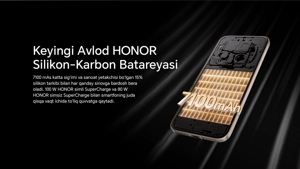 Смартфоннинг 7,100 мА/соат ҳажмли кремний-углеродли батареяси кун бўйи қувват билан таъминлайди, 100W симли ва 80W симсиз HONOR SuperCharge эса қувватни ўта тез тиклаш имконини беради. 6,71 дюймли LTPO OLED дисплей 1–120 Гц частота ва 6,000 nitsʼгача максимал ёрқинликни қўллаб-қувватлайди. Кўз саломатлиги учун эса 4320 Hz PWM Dimmʼнинг технологияси жорий этилган.
