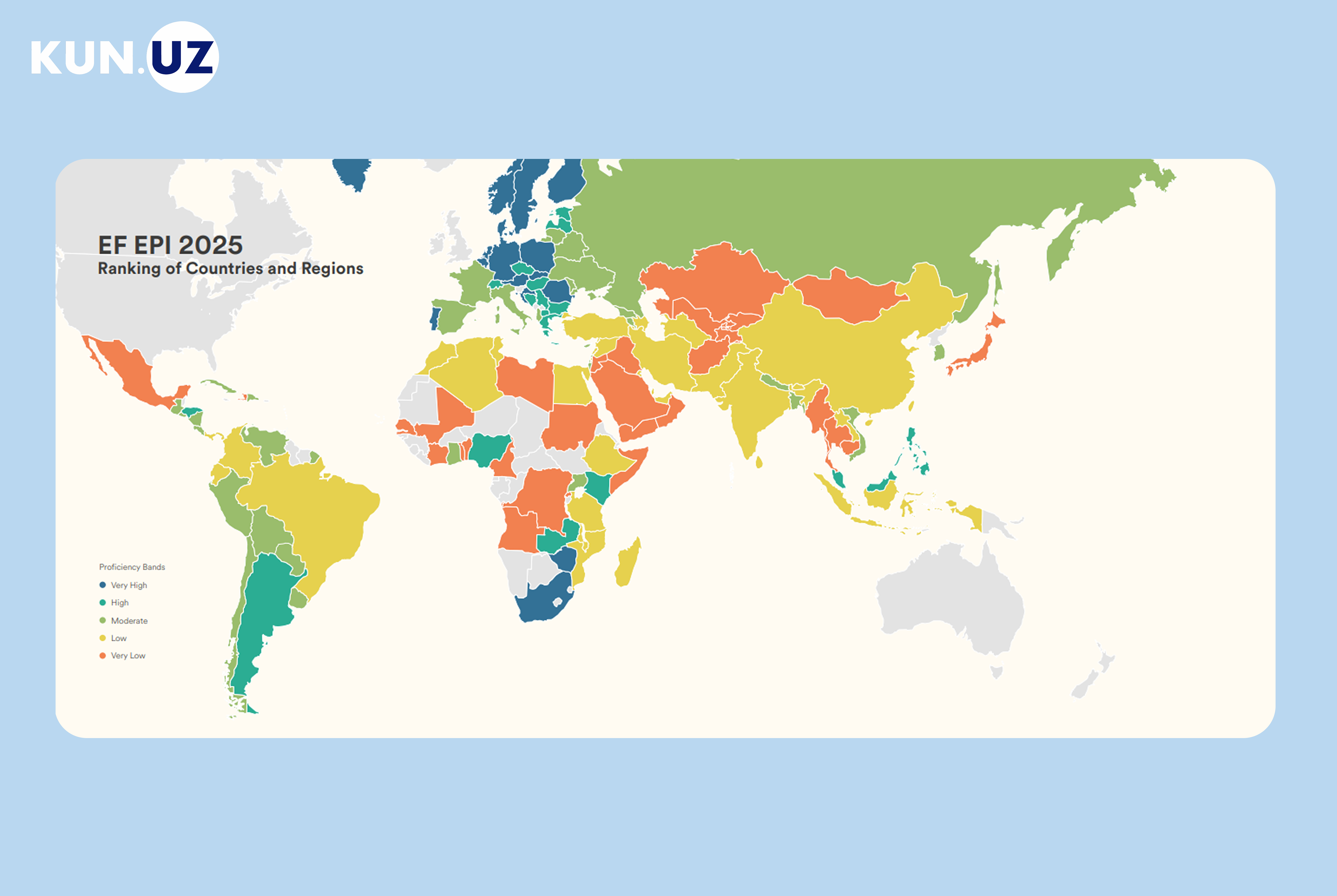 Бу халқаро EF классификацияси бўйича мамлакат инглиз тилини билиш қуйи даражада бўлган тоифага киришини англатади.