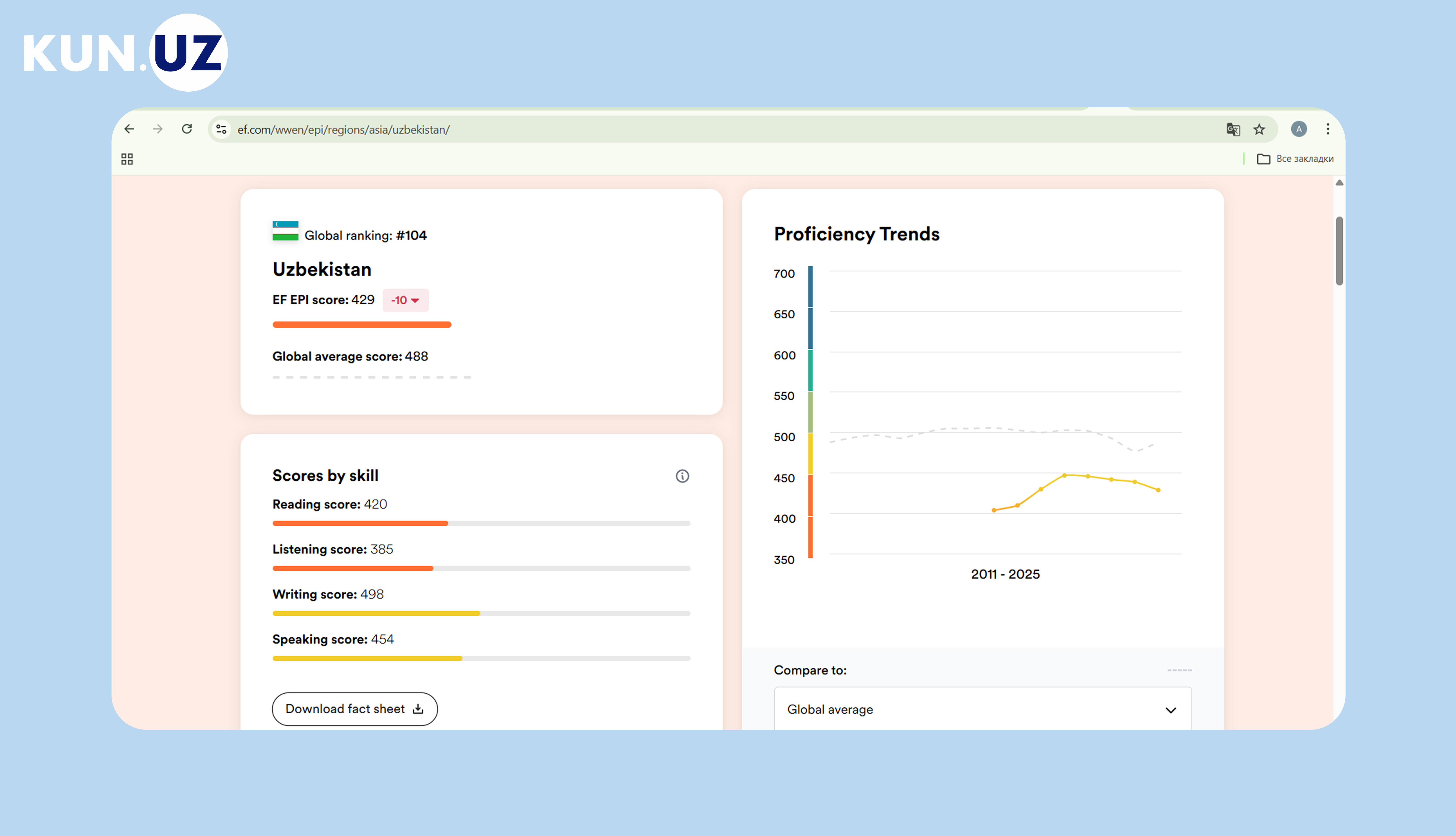 EF Education First маълумотларига кўра, Ўзбекистон бу борада дунёда 104-ўринда туради.