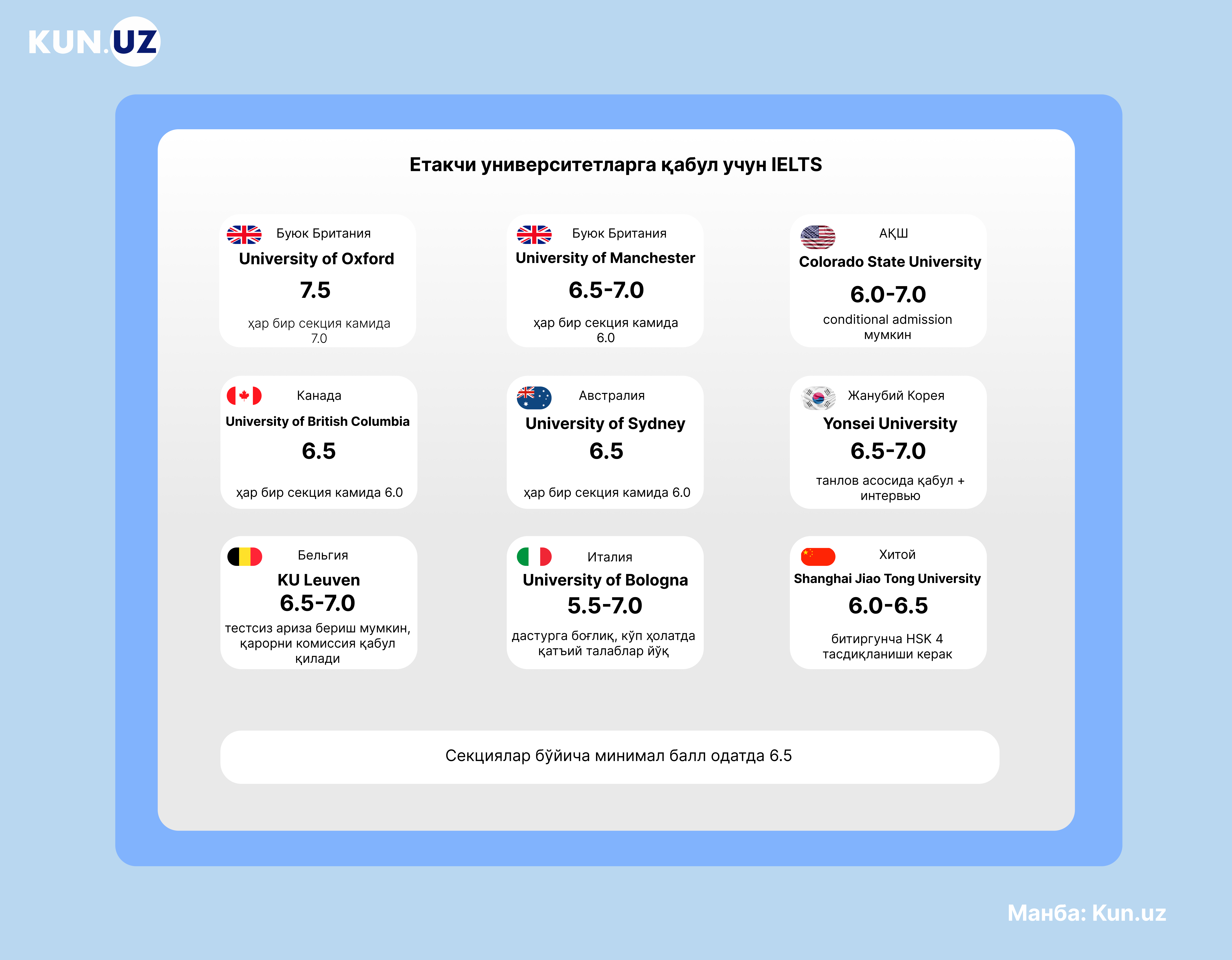 Биз Буюк Британия, АҚШ, Канада, Австралия, Европа ва Осиё университетларининг расмий талабларини жамладик ва IELTS’нинг қайси натижаси нафақат танловда иштирок этиш, балки ўқишга қабул қилиниш учун ҳақиқий имконият беришини аниқладик.