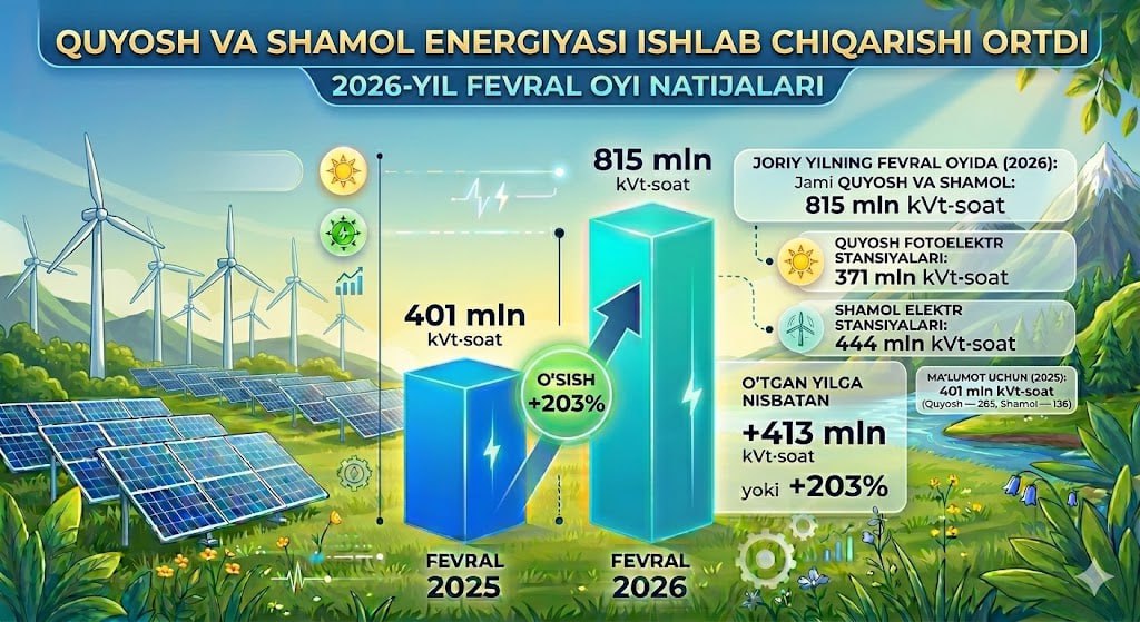 2026 йил феврал ойида Ўзбекистонда қуёш ва шамол электр станциялари томонидан ишлаб чиқарилган электр энергияси ҳажми ўтган йилнинг шу даврига нисбатан 203 фоизга ошди, дея хабар берди Энергетика вазирлиги.