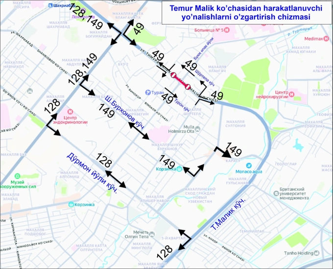 - 49-сонли автобус йўналишининг ТТЗ АШБ томон ҳаракати Т.Малик, Шўртепа-2, Шўртепа, Т.Малик кўчалари орқали ташкил этилади;