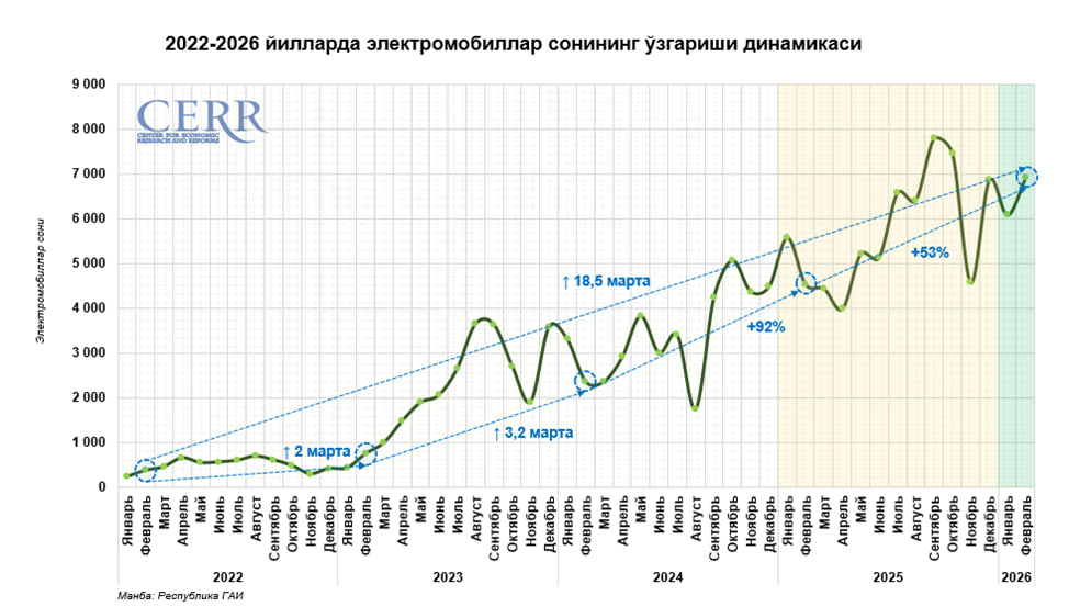 Енгил электромобиллар сегментида фаоллик барқарор ўсишни давом эттирмоқда. Февраль ойида савдо ҳажми 6,9 минг донани ташкил этди, бу ўтган ойга нисбатан 14 фоизга кўп.