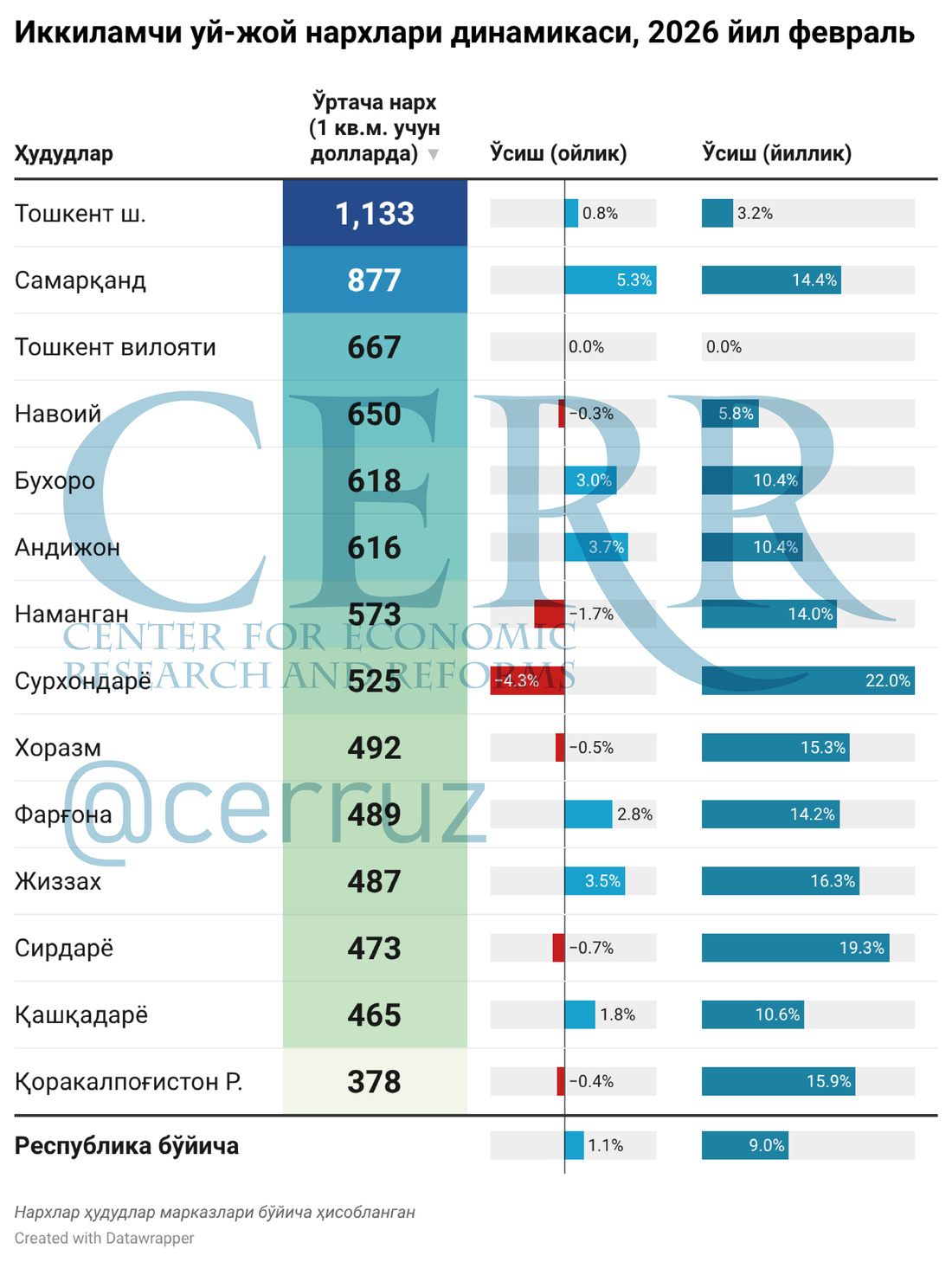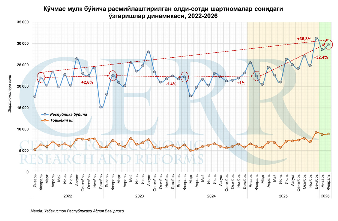 Иқтисодий тадқиқотлар ва ислоҳотлар маркази 2026 йил феврал ойи якунлари бўйича Ўзбекистонда кўчмас мулк бозори динамикасига оид янгиланган таҳлилни эълон қилди.