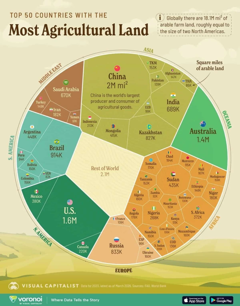 Янги инфографикада қишлоқ хўжалиги ерлари майдони бўйича 50 та мамлакат тақдим этилди. Бунда Жаҳон банки томонидан жамланган, Озиқ-овқат ва қишлоқ хўжалиги ташкилотининг энг сўнгги маълумотларидан фойдаланилган. Катта фарқ билан биринчи ўринни Хитой эгаллаб турибди, ундан кейин АҚШ ва Австралия келади.