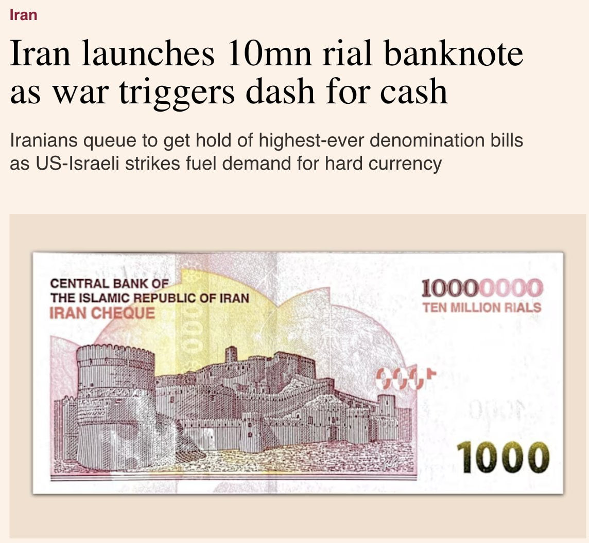 Эрон марказий банки 10 миллион риёллик банкнотга мурожаат қилди – бу мамлакат тарихидаги энг йирик номиналдир, дея ёзади Financial Times.