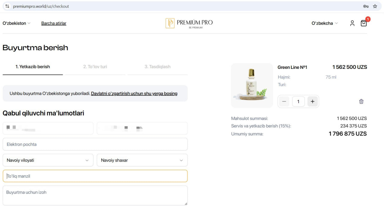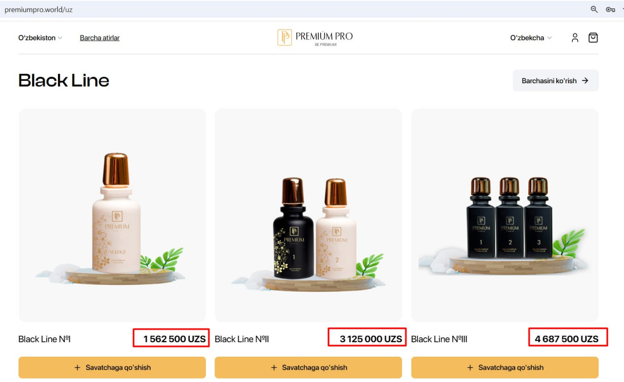 Premium Pro сайтида атирлар 3 хил нархда сотувга қўйилган: битталиги 1 562 500 сўм, иккиталиги 3 млн 125 минг сўм, учталиги 4 млн 687 500 сўм.