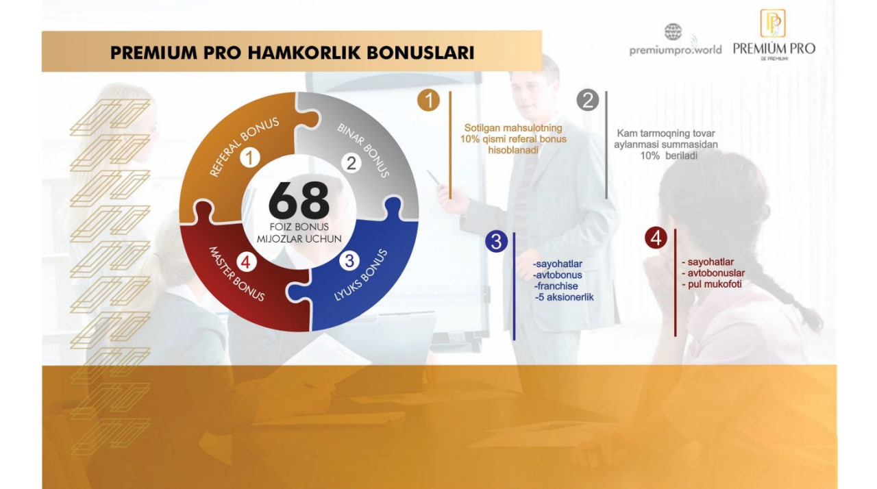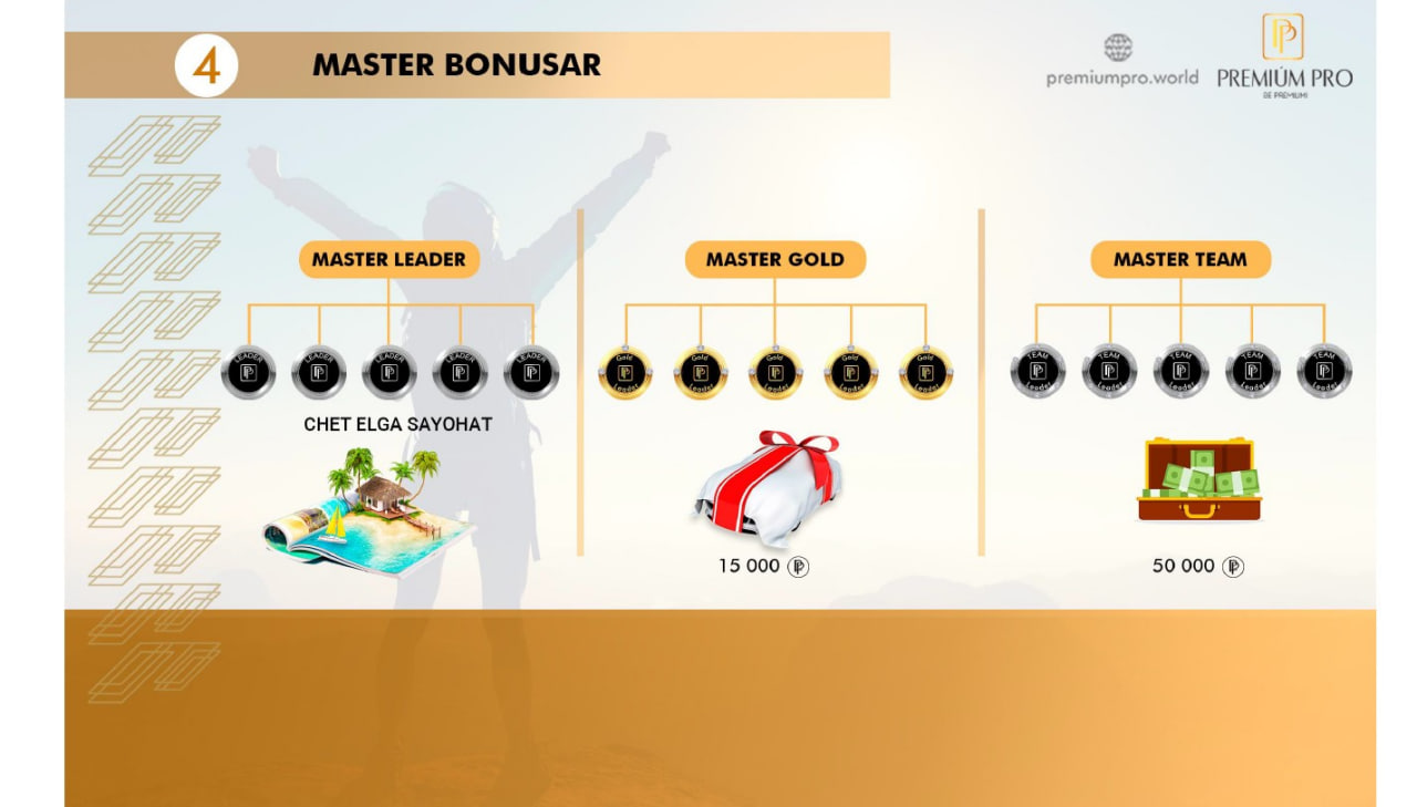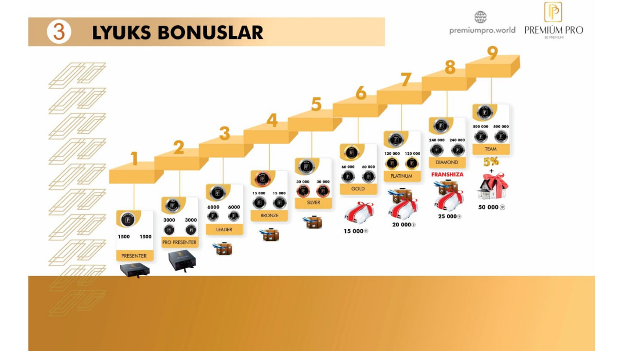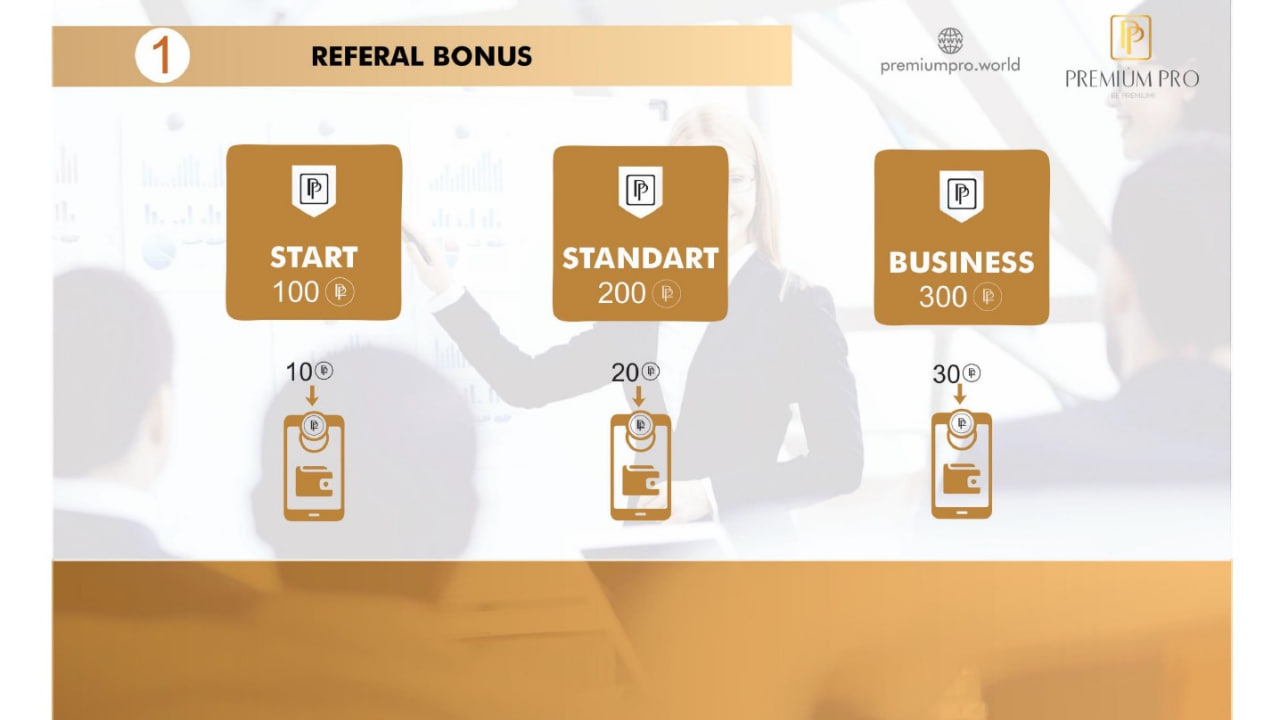 Premium Pro компанияси 4 та даражада ҳамкорлик бонусларини таклиф этган: реферал бонус, бинар бонус, люкс бонус ҳамда мастер бонус.