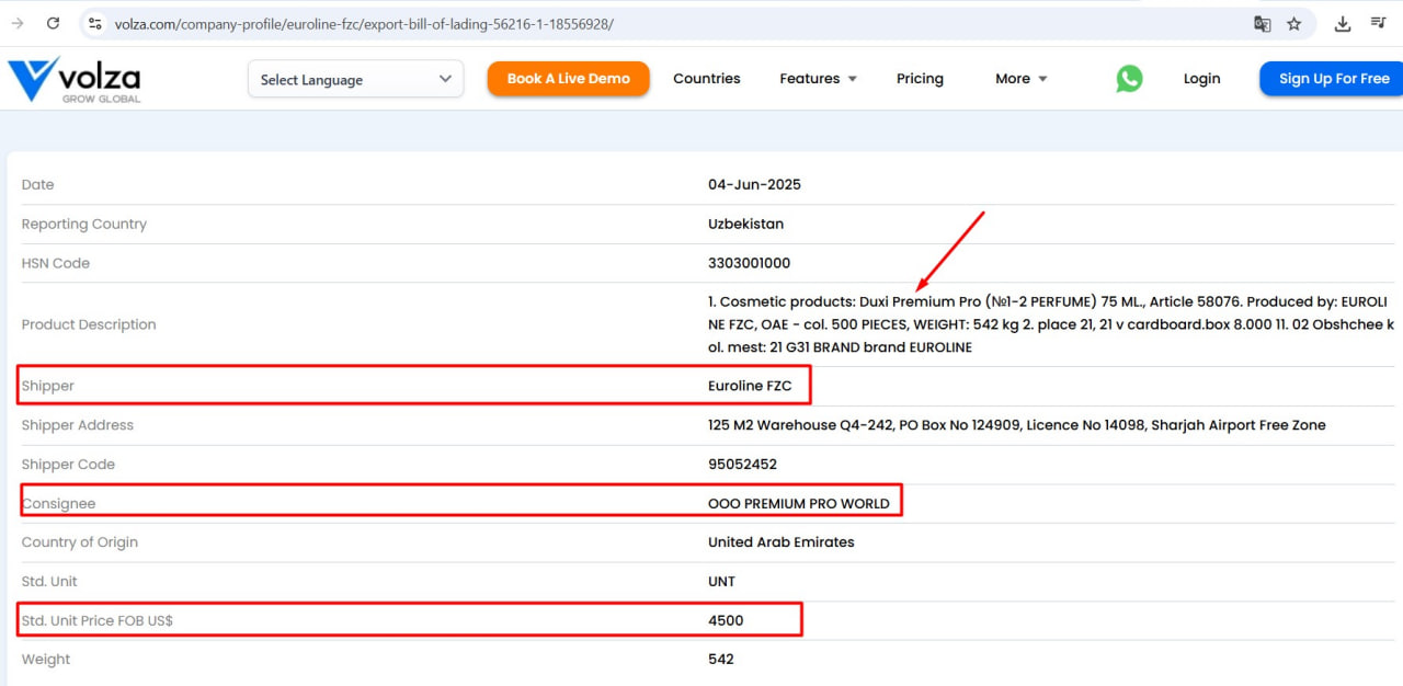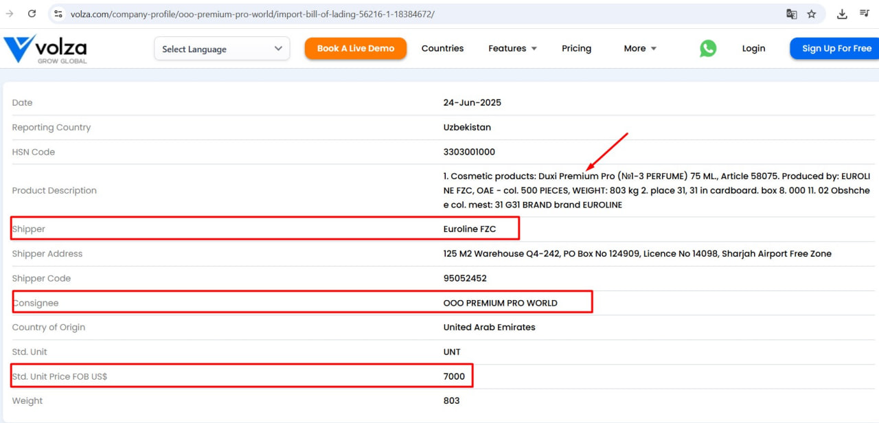 Халқаро даражада экспорт ва импорт маълумотларини тақдим этувчи Volza сайтида келтирилган айрим маълумотлар билан танишдик. Унда “Premium Pro world” масъулияти чекланган жамияти БААдаги Euroline корхонасидан Ўзбекистонга импорт қилган маҳсулотлар ҳақида айрим рақамлар бор.