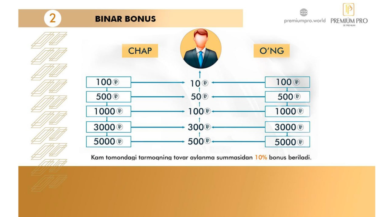 Бинар бонус эса кам тармоқли товар айланмаси суммасидан 10 фоизни ташкил қилади.