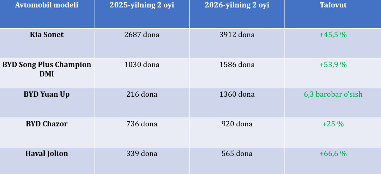 «Ўзавтосаноат» тақдим қилган маълумотларга кўра, 2026 йилнинг январ-феврал ойларида мамлакатдаги расмий дилерлар томонидан 57 минг 512 дона автомобил сотилган. Бу ўтган йилнинг мос даврига нисбатан 14,1 фоиз ёки 7 минг 139 донага кўп. Энг катта ўсиш электромобиллар сегментига тегишли моделлар билан юз беряпти.