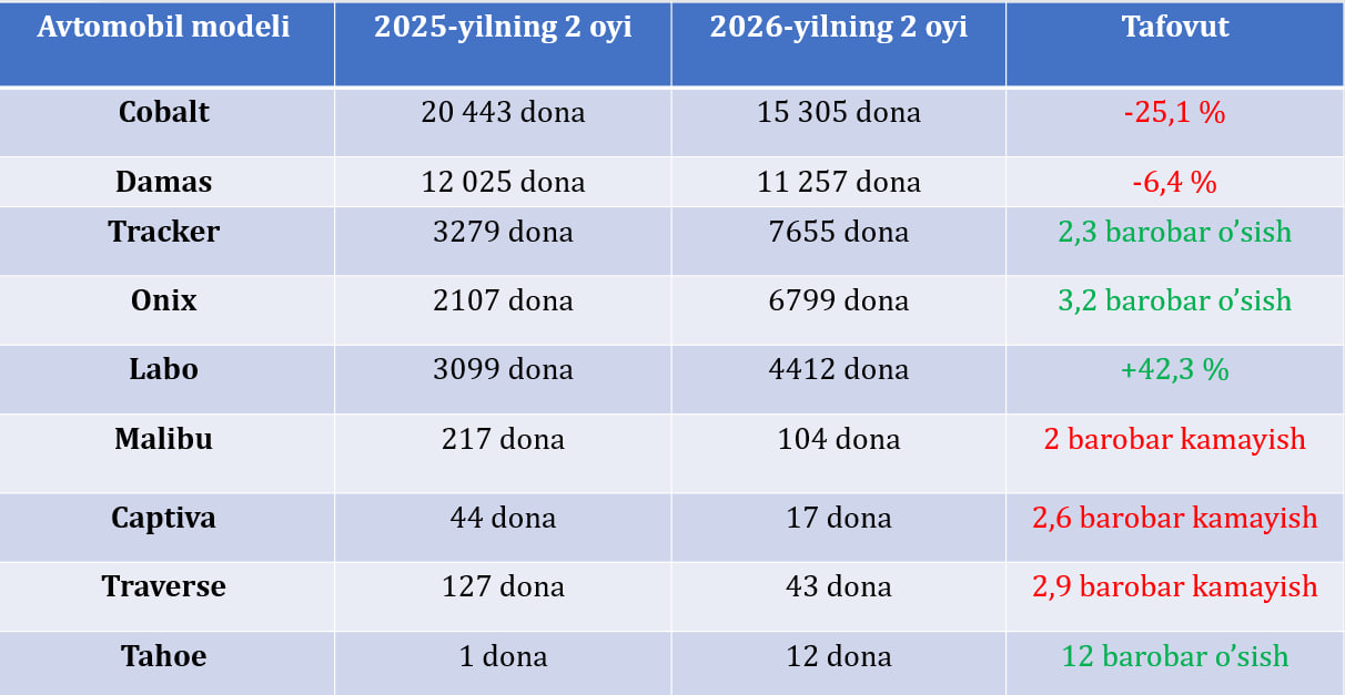 Жорий йилнинг дастлабки икки ойи давомида UzAuto Motors томонидан тақдим этилган 10 та моделдан тўрттасининг сотуви ошган, олтитасига талаб сезиларли даражада қисқарган. Хусусан, Tracker, Onix, Labo вa Tahoe сотувида ўсиш кузатилган бўлса, қиммат сегментдаги машиналар: Malibu, Captiva, Equinox, Traverse’га талаб тушиб кетган. Шунингдек, миллий компания томонидан энг кўп сотиладиган моделлар – Cobalt ва Damas сотуви ҳам қисқарган. Умуман олганда, ҳисобот даврида UzAuto Motors ʼнинг бозордаги улуши ўтган йилнинг мос даврига нисбатан 82,4 фоиздан 79,3 фоизгача қисқарган.