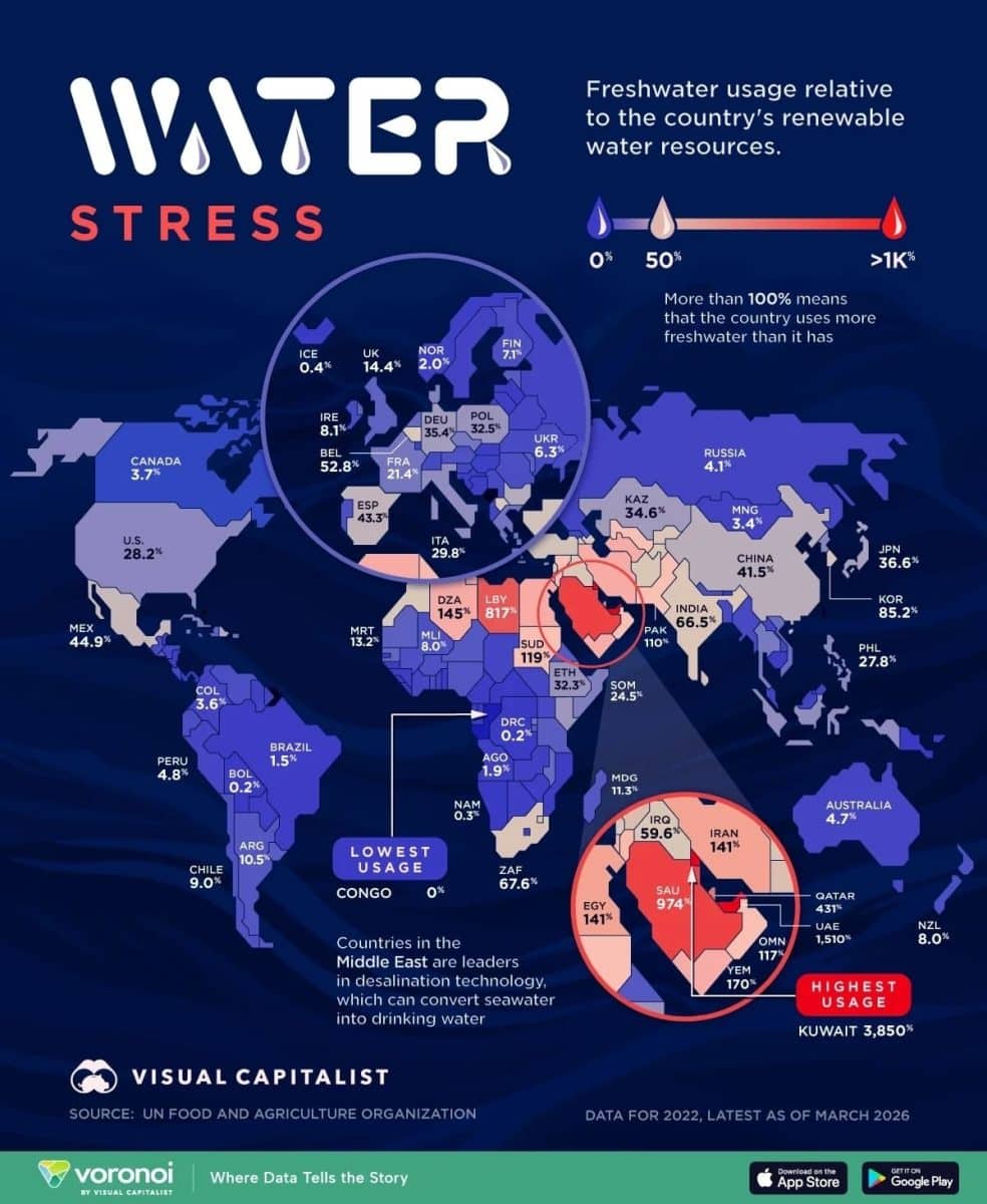 Янги харитада мамлакатлар бўйича сув стрессининг даражаси кўрсатилган — у чучук сув олиниши ҳажмининг қайта тикланувчи сув ресурслари ҳажмига нисбати орқали ўлчанади. Кўрсаткич 100 фоиздан юқори бўлган давлатлар бир йил давомида табиий йўл билан оладиган сувидан кўпроқ сув ишлатади ва танқисликни ерости сувларининг камайиши ёки денгиз сувини тузсизлантириш ҳисобига қоплашга мажбур бўлади. Маълумотлар БМТнинг Озиқ-овқат ва қишлоқ хўжалиги ташкилоти (FAO) томонидан тақдим этилган.