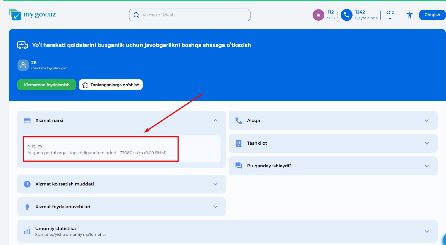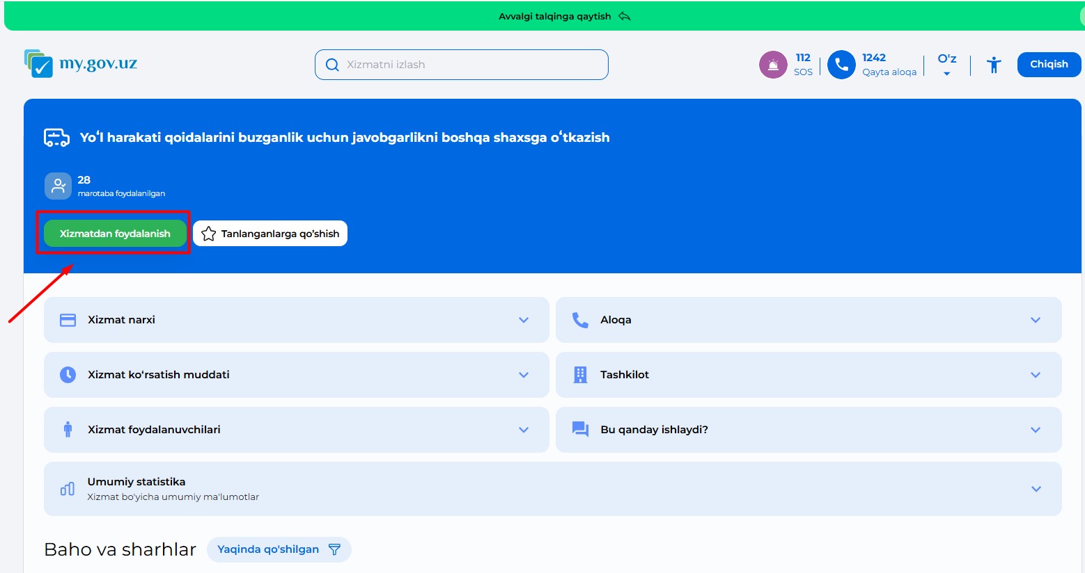 Шундан сўнг хизмат саҳифаси очилади. Бу ерда “хизматдан фойдаланиш” тугмасини босасиз.