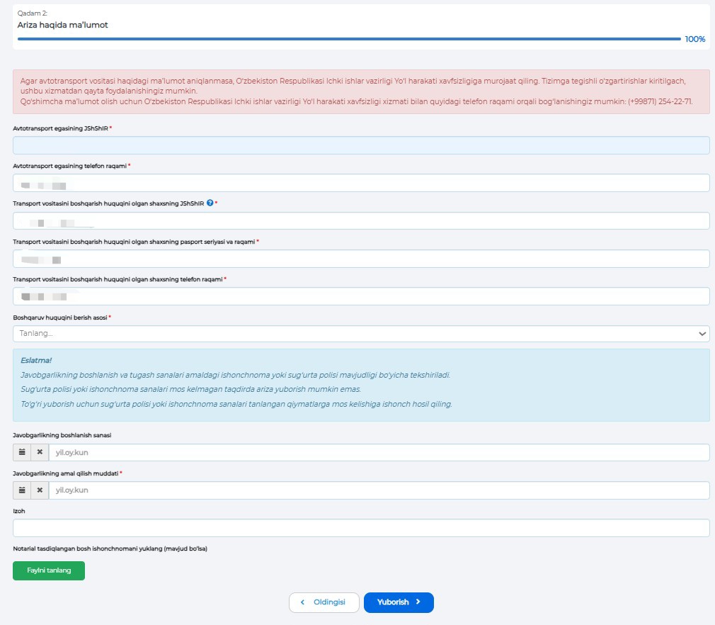 2-қадамда онлайн ариза сўровномаси шакллантирилади. Ариза берувчи унда жавобгарликни ўз зиммасига олувчи ҳайдовчининг шахсини тасдиқловчи ҳужжат маълумотларини, муддатни кўрсатади. Электрон ишончнома ва суғурта маълумотлари автоматик равишда текширилади. Агар машина бош ишончнома асосида бошқарилаётган бўлса, унинг электрон нусхаси сўровномага илова қилинади.