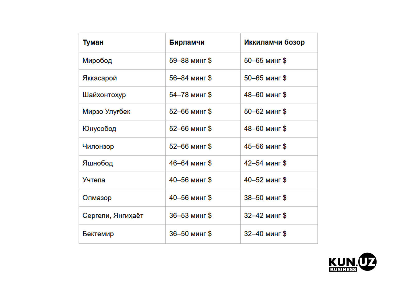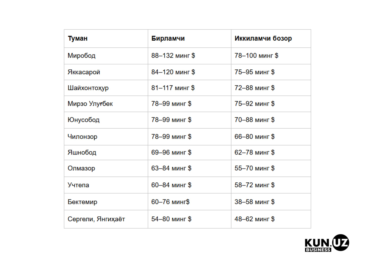 Бирламчи бозорда энг юқори нархлар асосан Миробод, Яккасарой ва Шайхонтоҳур туманларида. Сотув эълонларига кўра 1 квадрат метр нархлари қуйидагича: