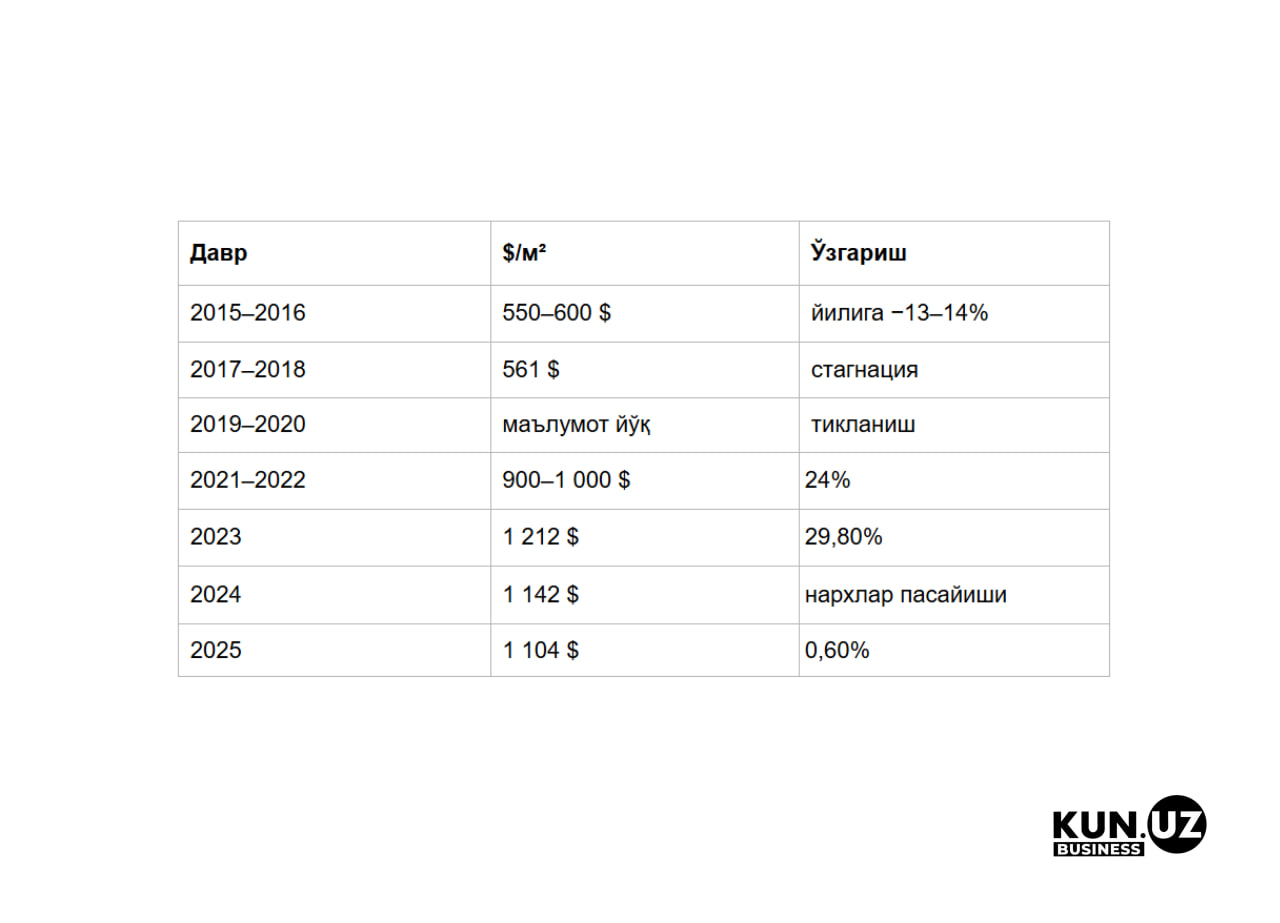 Сўнгги ўн йилликда Тошкентда турар жой нархи бир неча босқичдан ўтди: пасайиш, бир неча йил турғунлик ва 2021–2023 йилларда кескин қимматлашиш. Охирги йилларда нарх ўсиши секинлашди.