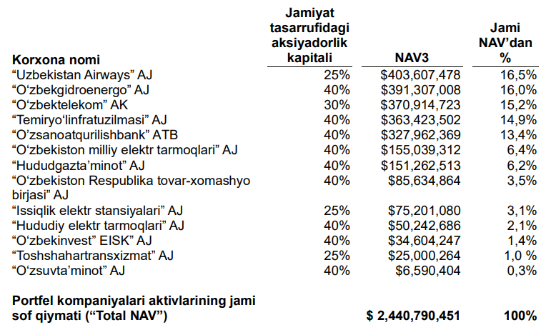 Kun.uz'га тақдим этилган пресс-релизда айтилишича, компания портфелидаги улушларнинг жами соф активлар қиймати 2025 йил 31 декабр ҳолатига 2,44 млрд долларга баҳоланган.