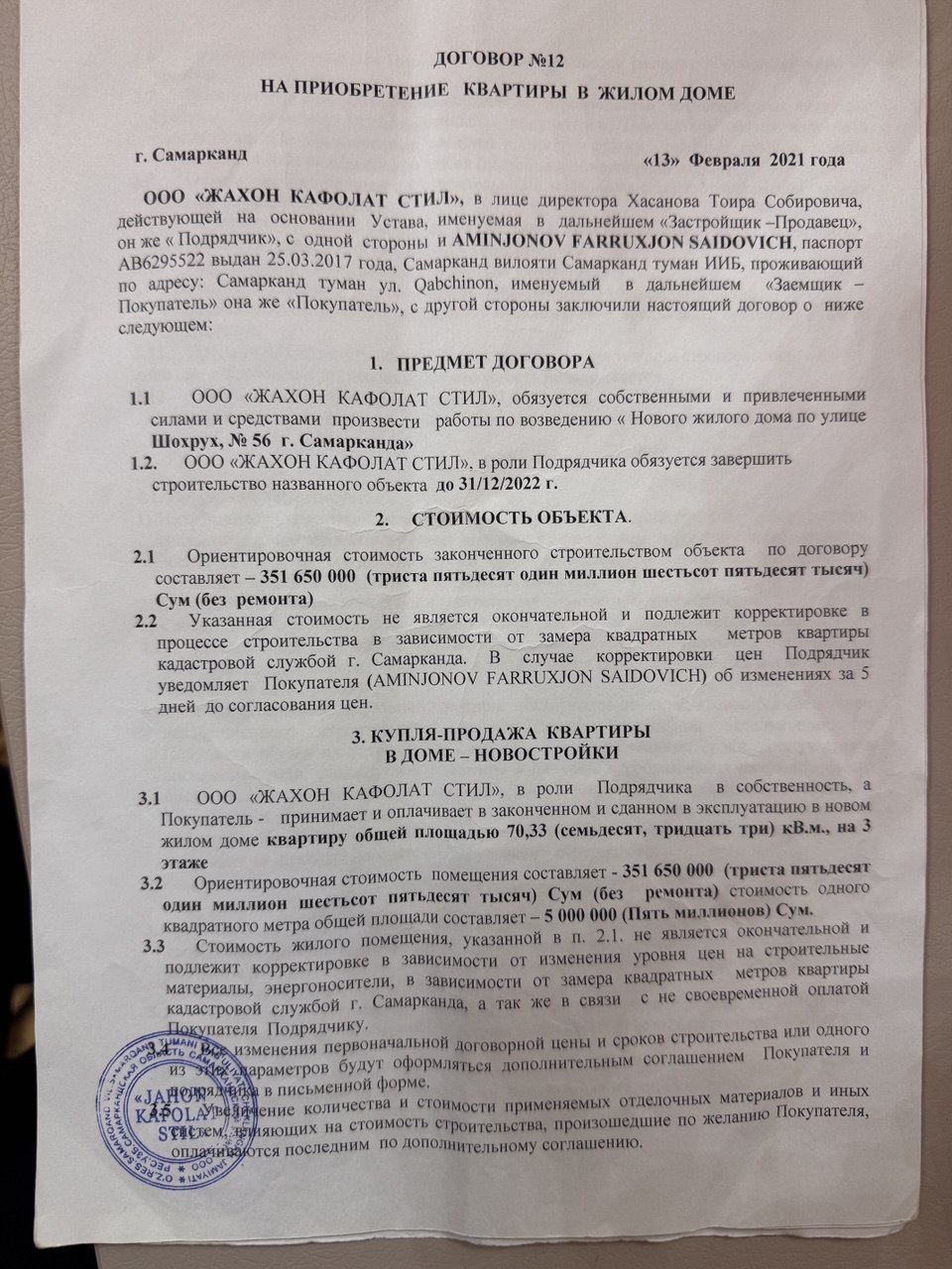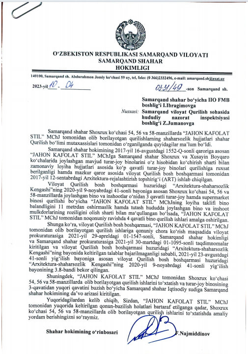 Самарқанд шаҳар ҳокимлиги берган маълумотга кўра, “JAHON KAFOLAT STIL” хусусий корхонаси томонидан амалга оширилган кўп қаватли уйлар қурилиши жараёнида бир қатор жиддий қонунбузилишлар аниқланган. Жумладан, қурилиш ишлари тасдиқланган лойиҳа ҳужжатлари ва шаҳарсозлик нормаларига зид равишда олиб борилгани, белгиланганидан ортиқча қаватлар қурилгани, тегишли рухсатномалар ва хулосаларсиз ишлар давом эттирилгани қайд этилган. Шу сабабли ваколатли идоралар томонидан қурилиш ишлари тўхтатилган. Ҳозирда мазкур объект муаммоли уйлар рўйхатига киритилган бўлиб, ҳолатни ҳуқуқий жиҳатдан тартибга солиш, камчиликларни бартараф этиш ва лойиҳанинг кейинги тақдирини ҳал қилиш юзасидан ўрганиш ва ечим топиш ишлари амалга оширилмоқда.