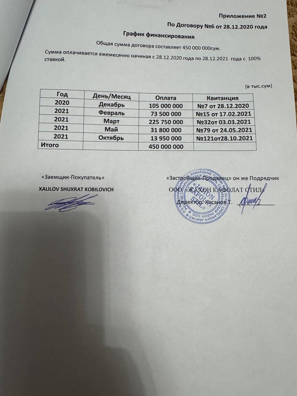 Хўжаёровга кўра, бу ҳудуддаги уйлар қурилиши 11 метрдан ошмаслиги қайд этилган. 11 метрли кўп қаватли уйлар одатда уч қаватдан ошмайди. Қурувчи эса лойиҳадан ташқарига чиққан, уйни тўрт қават қилиб қурган. Қолаверса, мижозлардан ҳам кўплаб эътирозлар, мурожаатлар тушган. Натижада Самарқанд шаҳар ҳокимлиги томонидан судга даъво аризаси киритилган ва қурувчининг ўзи ҳисобидан ортиқча қаватни бузиш бўйича суд қарори қабул қилинган.