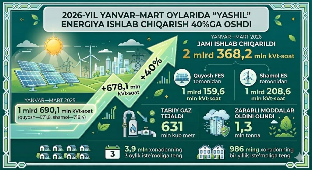 Таққослаш учун, 2025 йилнинг январ-март ойларида қуёш ва шамол электр станциялари 1 млрд 690,1 млн кВт/соат (қуёш — 971,8 млн, шамол — 718,4 млн кВт/соат) электр энергияси ишлаб чиқарганди.