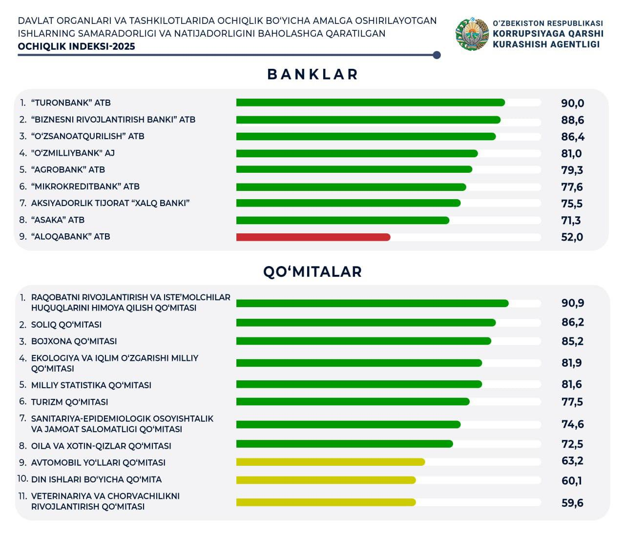 ​​​​​​​2025 йилнинг энг очиқ ва энг ёпиқ давлат ташкилотлари рейтинги эълон қилинди. Энг яхши натижаларни «Ўзбекгидроэнерго», «Навоий кон-металлургия комбинати» ҳамда «Ўзавтосаноат» қайд этди. Умумий рейтингда энг ёмон кўрсаткични қайд этганлар қаторида Тошкент шаҳарва вилоят ҳокимлиги, Андижон вилояти ҳокимлиги, «Ўзбекистон темирйўллари», Судялар Олий кенгаши, АТБ Алоқабанк ҳам бор.