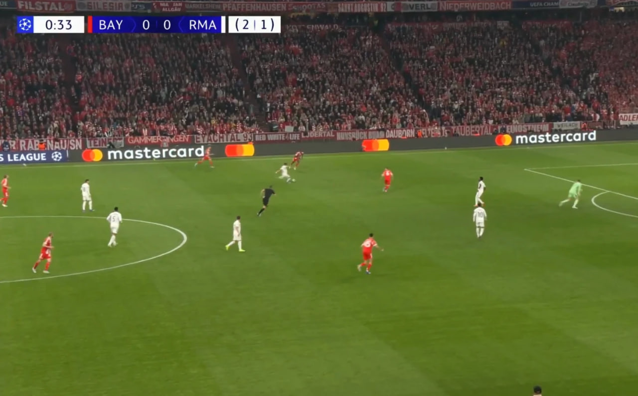 «Бавария» кутилганидек ўйинни назорат қилди. Аммо 4-4-2 схемасида ҳимояланган «Реал» исталган вақтда тезкор қарши ҳужумлар уюштириш имконига эга бўлди – ҳимоя чизиғини юқори ўрнатган мезбонлар орқада бунинг учун етарлича бўшлиқлар қолдирди.