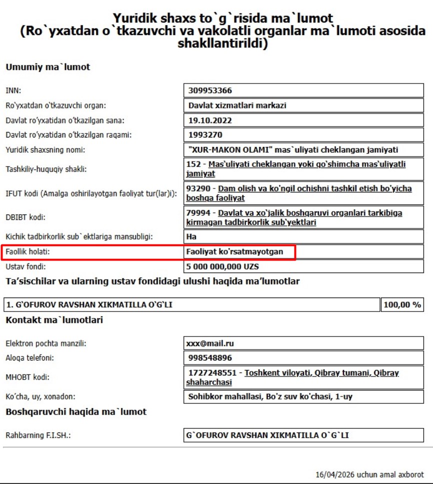 Ойбек Раҳмонбердиевнинг Наргиза Хонтўраевага хати 2026 йил 30 март куни чиқарилган. Аммо хатда номи келтирилган “Xur-makon olami” МЧЖ фаолияти аллақачон тугатилиб кетгани аниқланди.