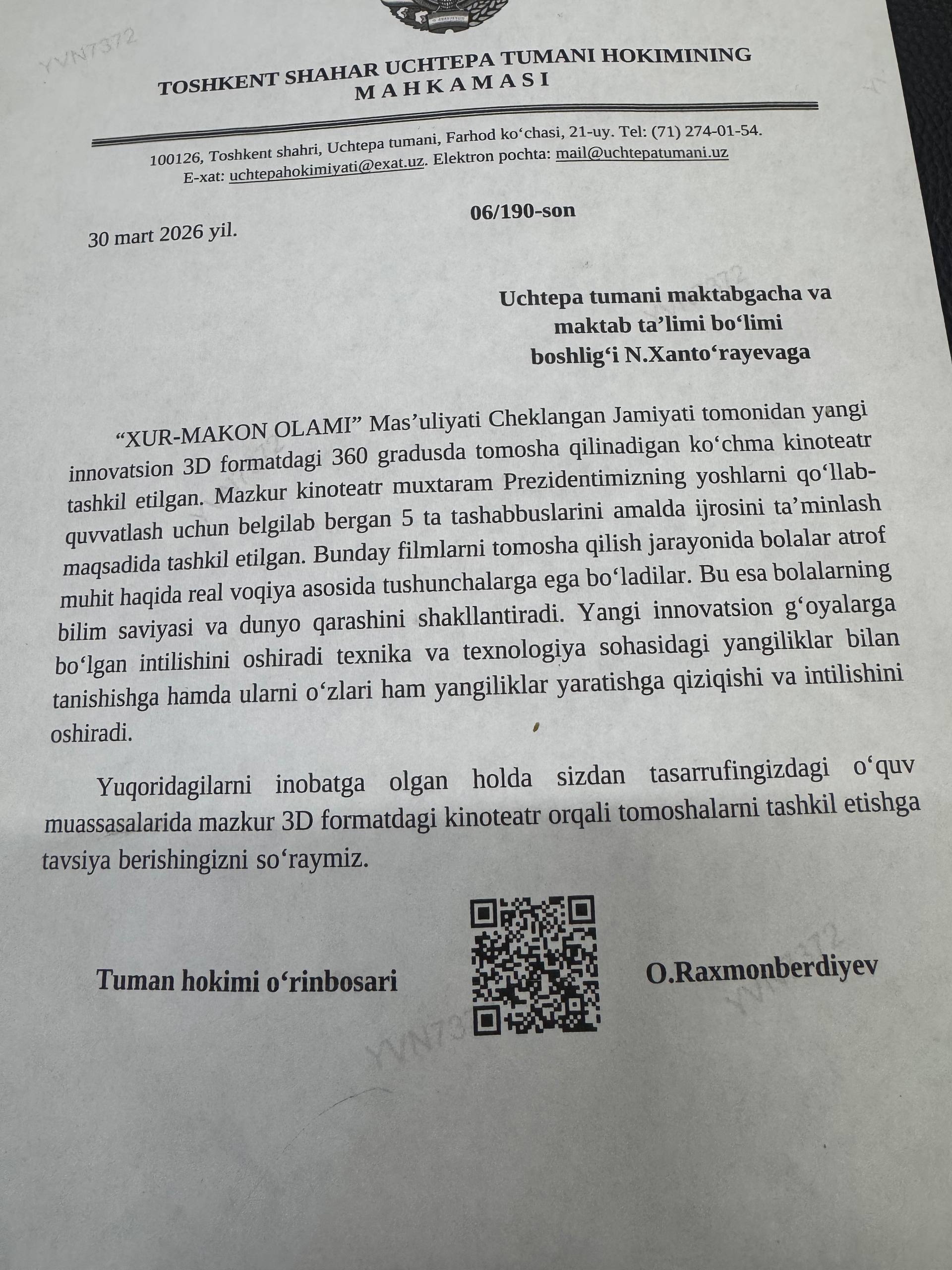 Ойбек Раҳмонбердиевнинг хати Учтепа тумани Мактабгача ва мактаб таълими бўлими раҳбари Наргиза Хонтўраевага чиқарилган. Унда “Xur-makon olami” МЧЖ томонидан янги инновацион 3D форматдаги 360 градусда томоша ташкил этилгани айтилади.