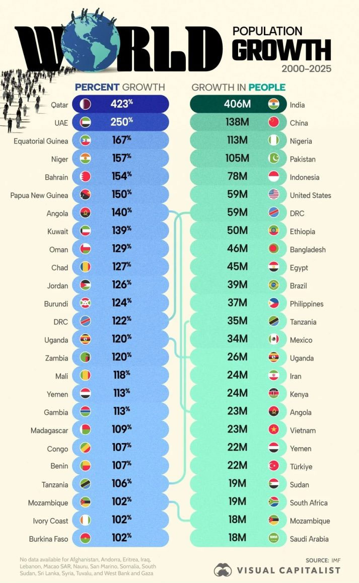 2000 йилдан бери аҳоли сони энг кўп ошган давлатлар: мамлакатлар рейтинги / © Visual Capitalist