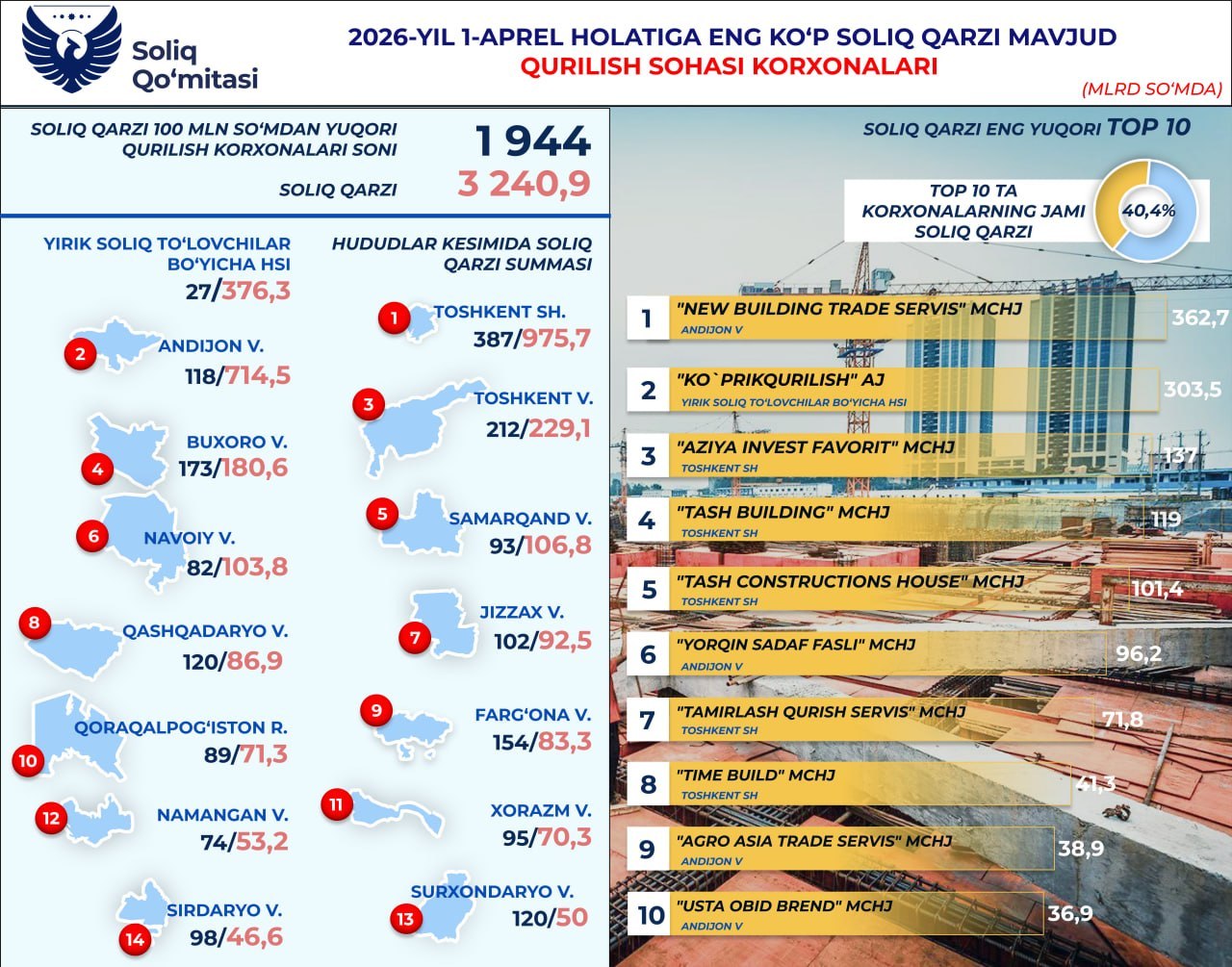 2026 йил 1 апрел ҳолатига солиқ қарзи 100 млн сўмдан юқори қурилиш корхоналари сони 1944 тани ташкил этяпти, дея хабар берди Солиқ қўмитаси.