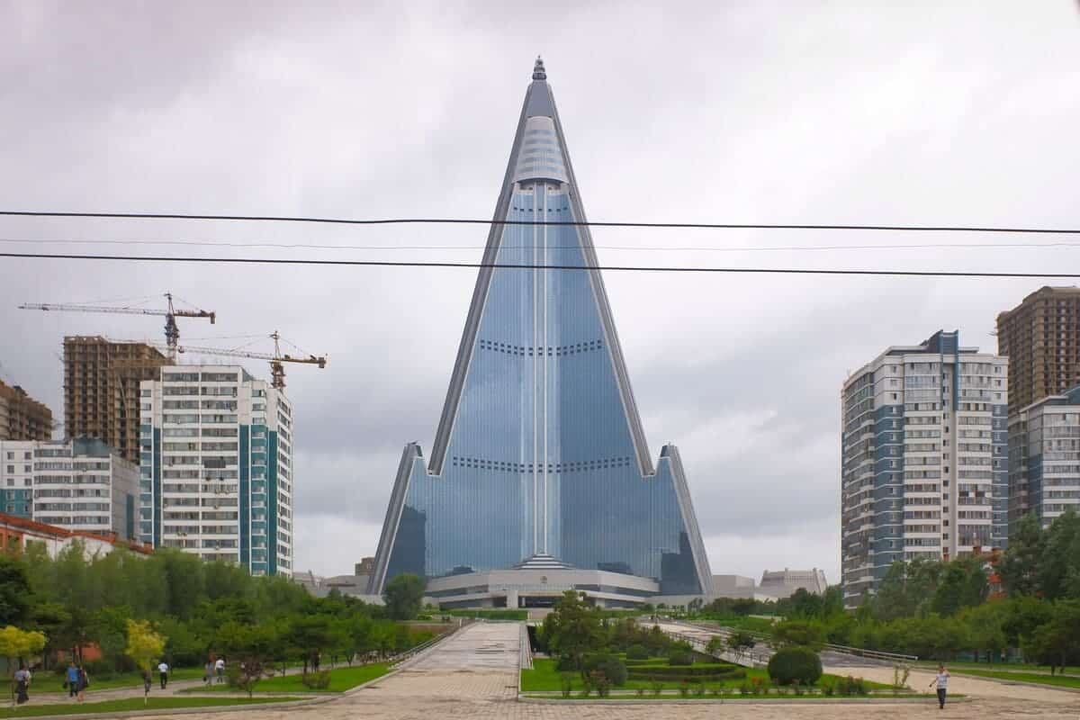 330 метрли пирамидасимон бинo қурилиши 1987 йилда бошланган ва 1992 йилгача давом этган. Ўша йили Совет Иттифоқининг парчаланиши КХДРда иқтисодий инқирозга олиб келган. Шу пайтга келиб бино тўлиқ баландликка етган ва дунёда баландлиги бўйича саккизинчи ўринга чиққан — у ҳатто Chrysler Building'дан ҳам баланд бўлган ва Осиёдаги иккинчи супербаланд осмонўпар бино ҳисобланган.