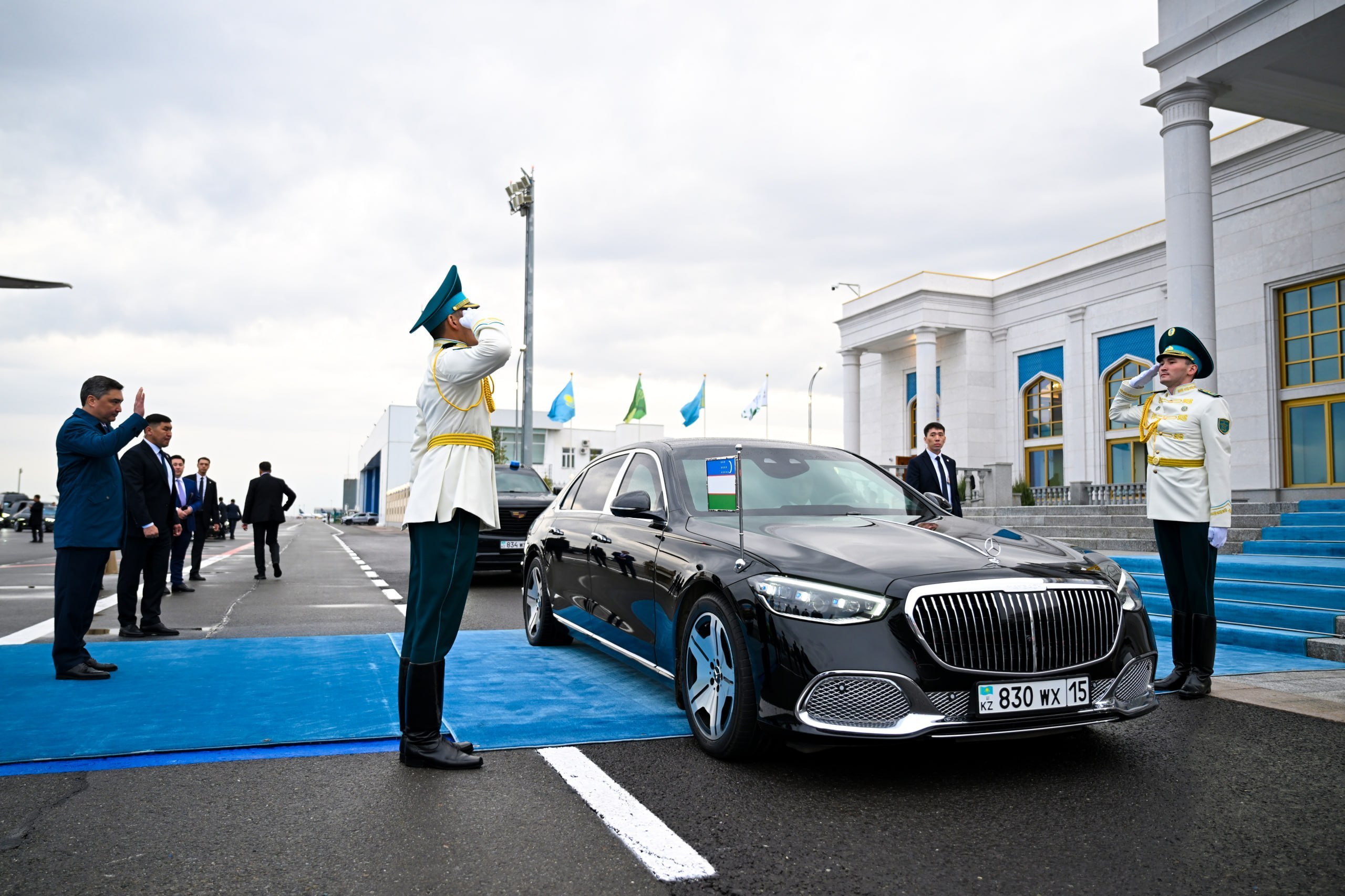 Қозоғистон пойтахти аэропортида давлат раҳбарини мамлакат бош вазири Ўлжас Бектенов ва бошқа расмий шахслар кутиб олди.