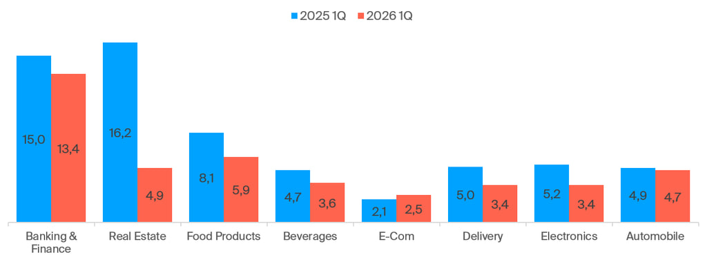 Бундан келиб чиққан қонуний натижа сифатида, 2026 йилнинг биринчи чорагида органик пасайиш кузатилди – DOOH соҳасига киритилган умумий инвестициялар ҳажми 5,1 миллион долларгача тушиб кетди (2025 йилнинг мос давридаги 8,2 миллион доллар билан солиштирганда). Бундай динамиканинг асосий сабабларидан бири ўтган йили етакчилик қилган йирик девелоперлар (“Кўчмас мулк” тоифаси) томонидан бюджетларнинг кескин қисқартирилиши бўлди. Бугунги кунда эса ташқи рекламадги энг фаол реклама берувчилар мақомини Banking & Finance сектори брендлари эгаллади.