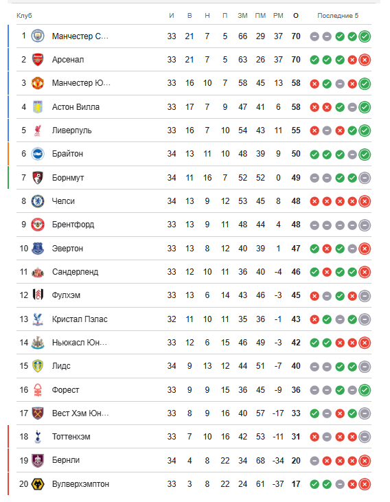 1:0 – Гвардиола жамоаси 20 дан ортиқ зарба берган бўлса-да, кичик ҳисобдаги ғалаба билан чекланди. Аммо «Сити» очколари сонини «Арсенал»никига етказиб олди (70 тадан) ва тўплар нисбати бир хил бўлганига (+37) қарамай, кўпроқ гол ургани эвазига (63 га қарши 66) турнир жадвалида биринчи ўринга кўтарилди. «Бёрнли» эса расман АПЛ билан хайрлашди – жамоа кейинги мавсумни яна чемпионшипда ўтказади.